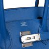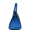 This Sellier Birkin is in Bleu France epsom leather with palladium hardware and has tonal stitching, front flap, two straps with center toggle closure, clochette with lock and two keys, and double rolled handles.