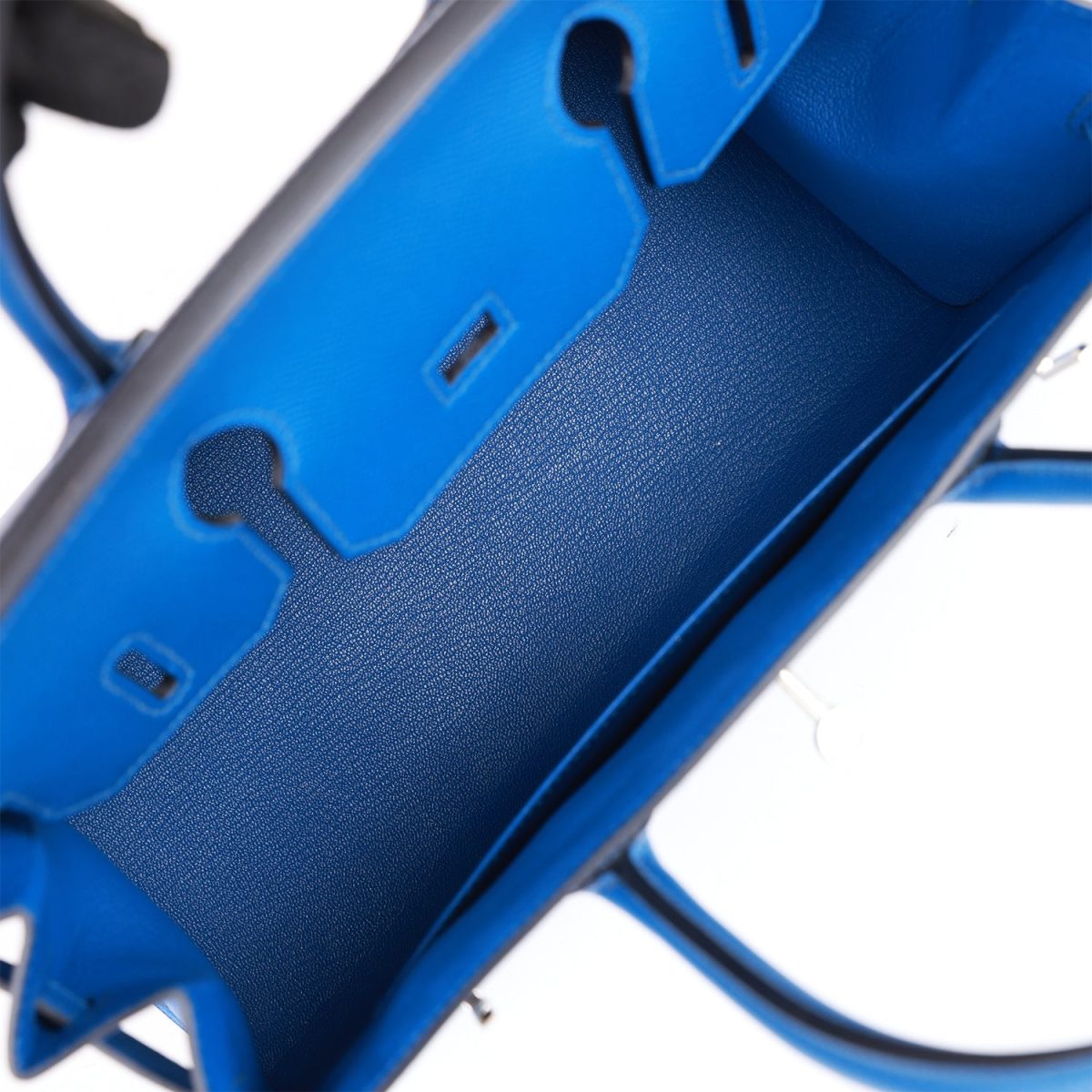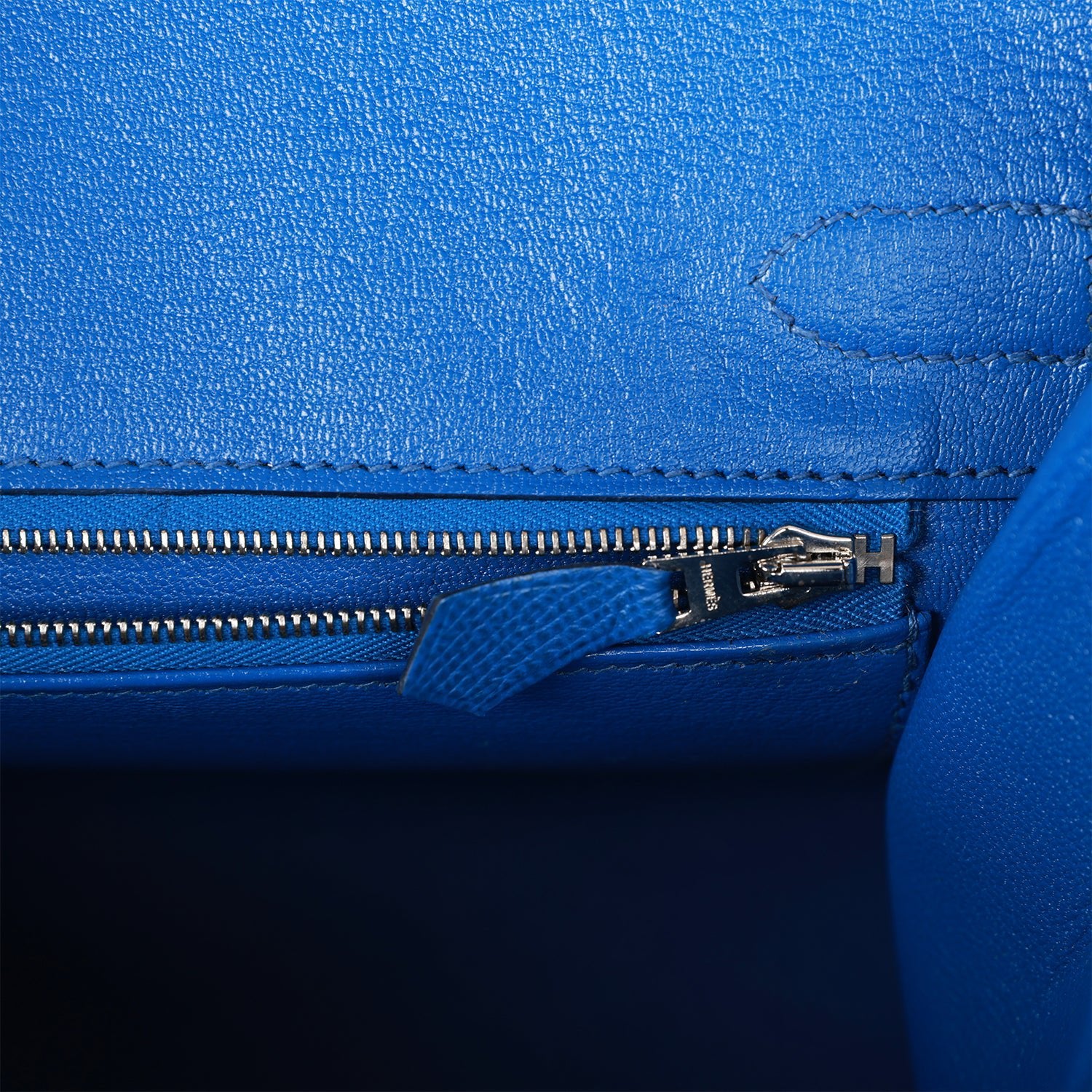 This Sellier Birkin is in Bleu France epsom leather with palladium hardware and has tonal stitching, front flap, two straps with center toggle closure, clochette with lock and two keys, and double rolled handles.