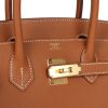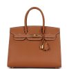 This Birkin is in Gold epsom leather with gold hardware and has contrast stitching, front flap, two straps with center toggle closure, clochette with lock and two keys, and double rolled handles.