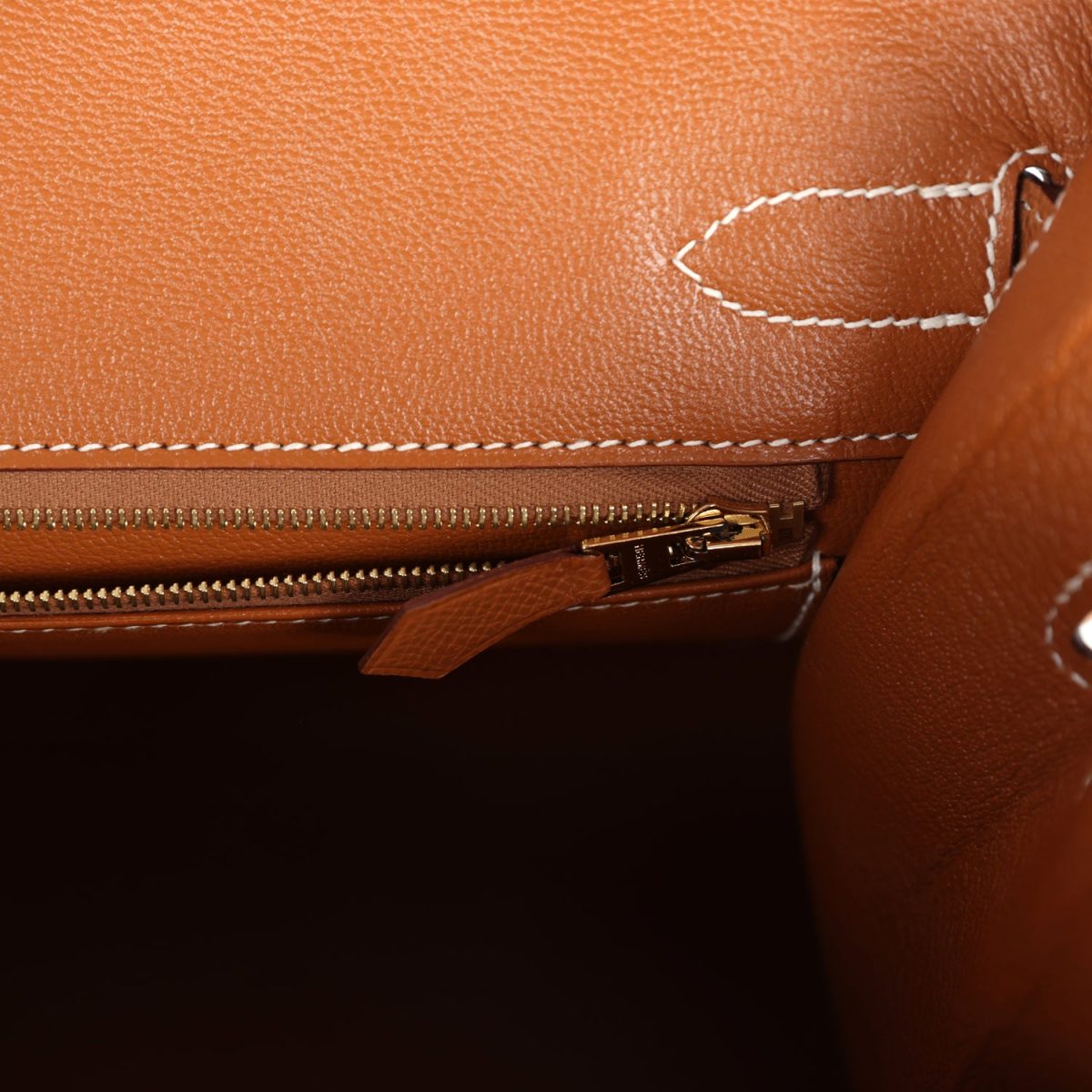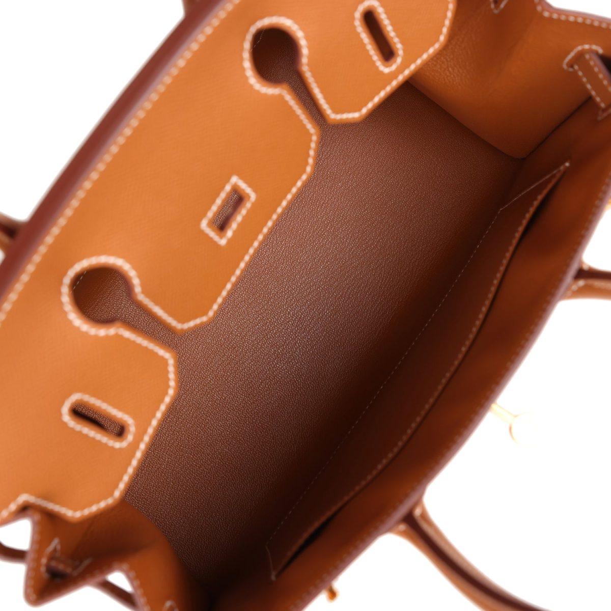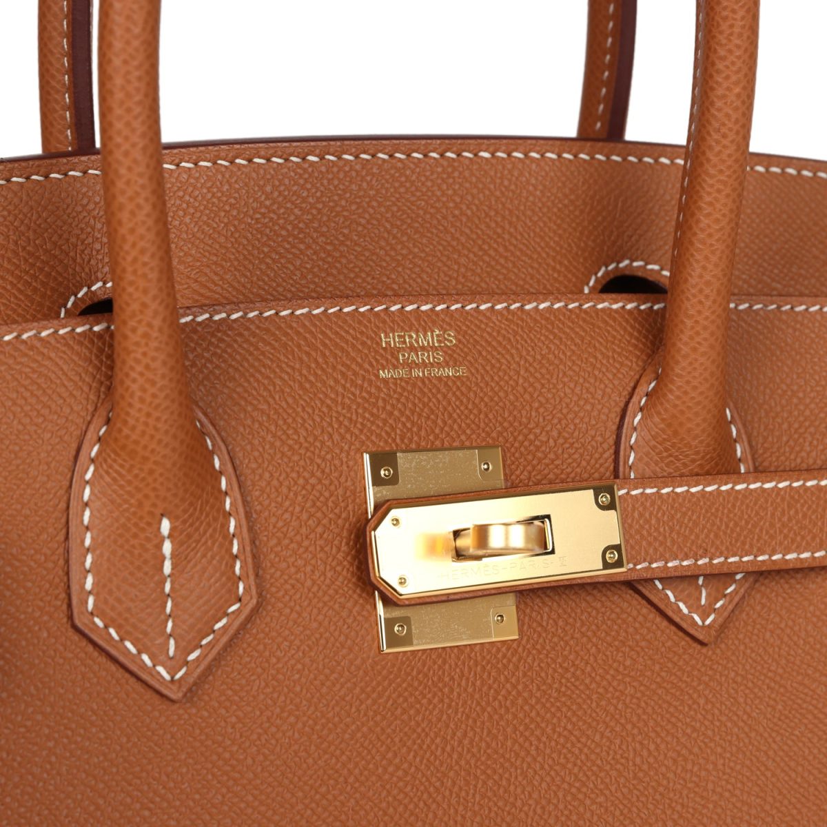 This Birkin is in Gold epsom leather with gold hardware and has contrast stitching, front flap, two straps with center toggle closure, clochette with lock and two keys, and double rolled handles.