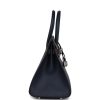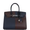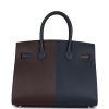 This Casaque Birkin is in Rouge Sellier and Bleu Indigo epsom leather with palladium hardware, tonal/contrast stitching, front flap with two straps, front toggle closure, clochette with lock and two keys, and double rolled handles.