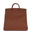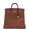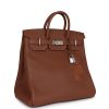 This rare limited edition Coup De Soleil Birkin HAC 40 is in Gold togo leather with palladium hardware and features a stencil-like “sunburn” effect of the clochette, lock, and front flap on the front of the bag, has tonal stitching, two straps with HAC toggle closure, clochette with lock and two keys and double rolled handles.