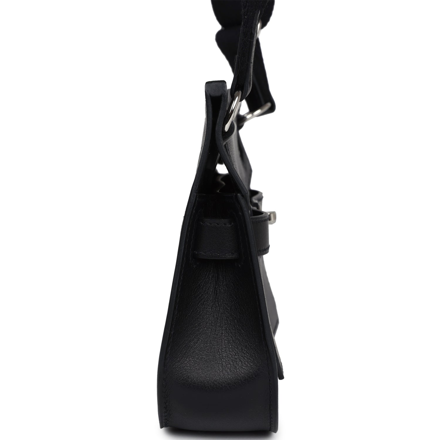 This Jypsiere mini is in Black evercolor leather with palladium hardware and has tonal stitching, a single flap, two pull straps, turnlock closure, and an adjustable wooly shoulder strap.