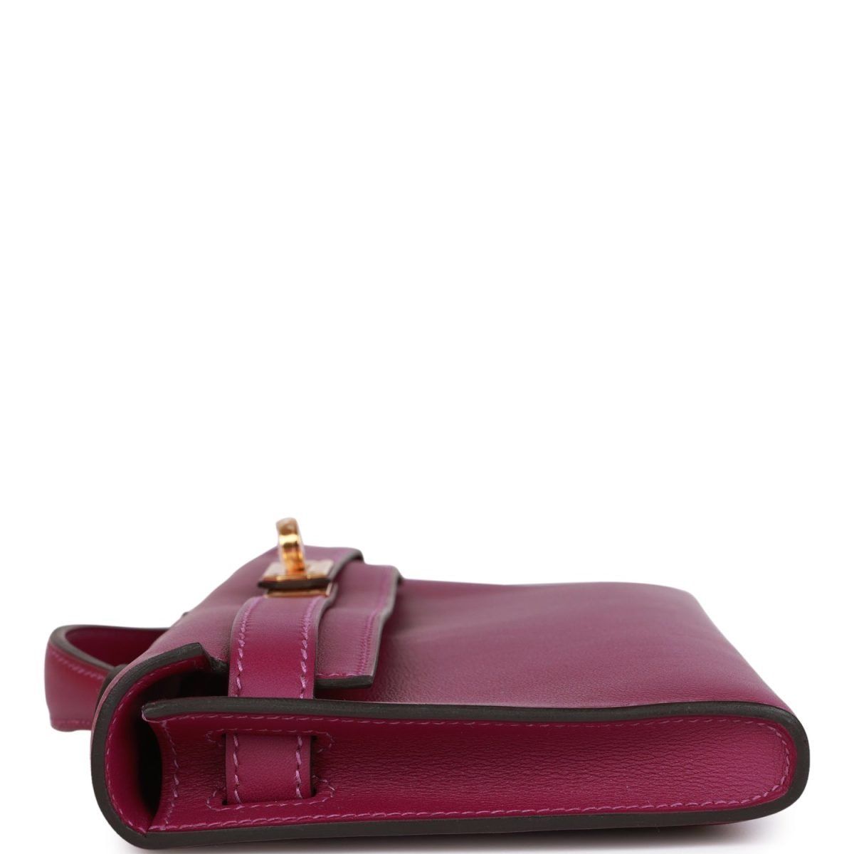 This Kelly Cut is in Anemone swift leather with gold hardware and has tonal stitching, two straps with front toggle closure and a top flat handle.