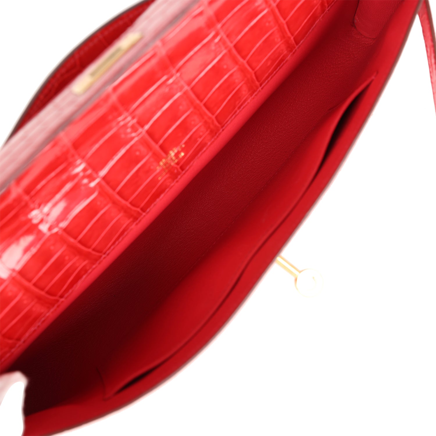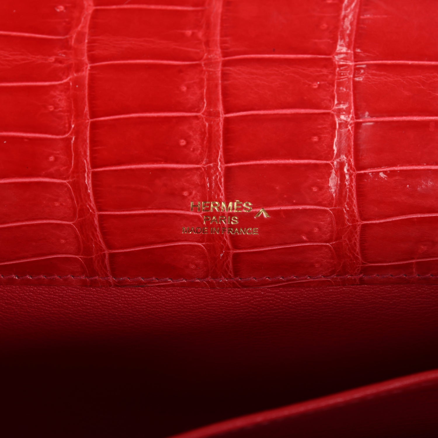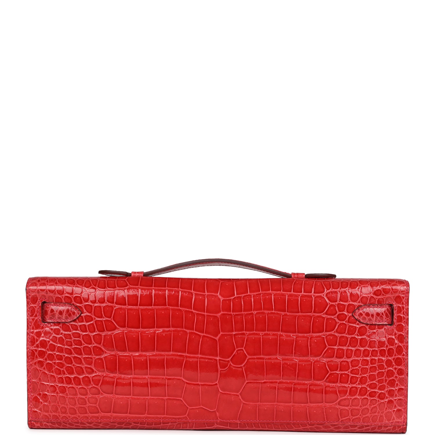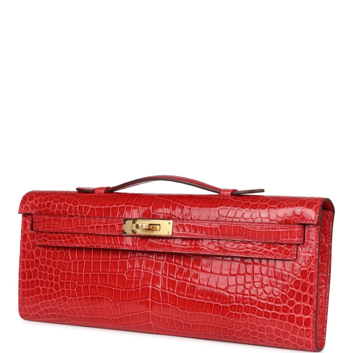 Measurements: 12.25" width x 5" height x 1" depth; 1" handle drop This Kelly Cut is in Bougainvillea shiny porosus crocodile with gold hardware and has tonal stitching, two straps with front toggle closure and a top flat handle. The interior is lined with Bougainvillea chevre and has an open wall pocket.