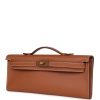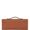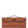 This Hermès Kelly Cut is in Gold swift leather with gold hardware, features contrast stitching, front flap, pull straps that attach to a toggle, and small top handle.