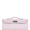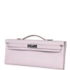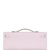 This Kelly Cut wallet is in Mauve Pale swift leather with palladium hardware and has tonal stitching, two straps with front toggle closure and a top flat handle.