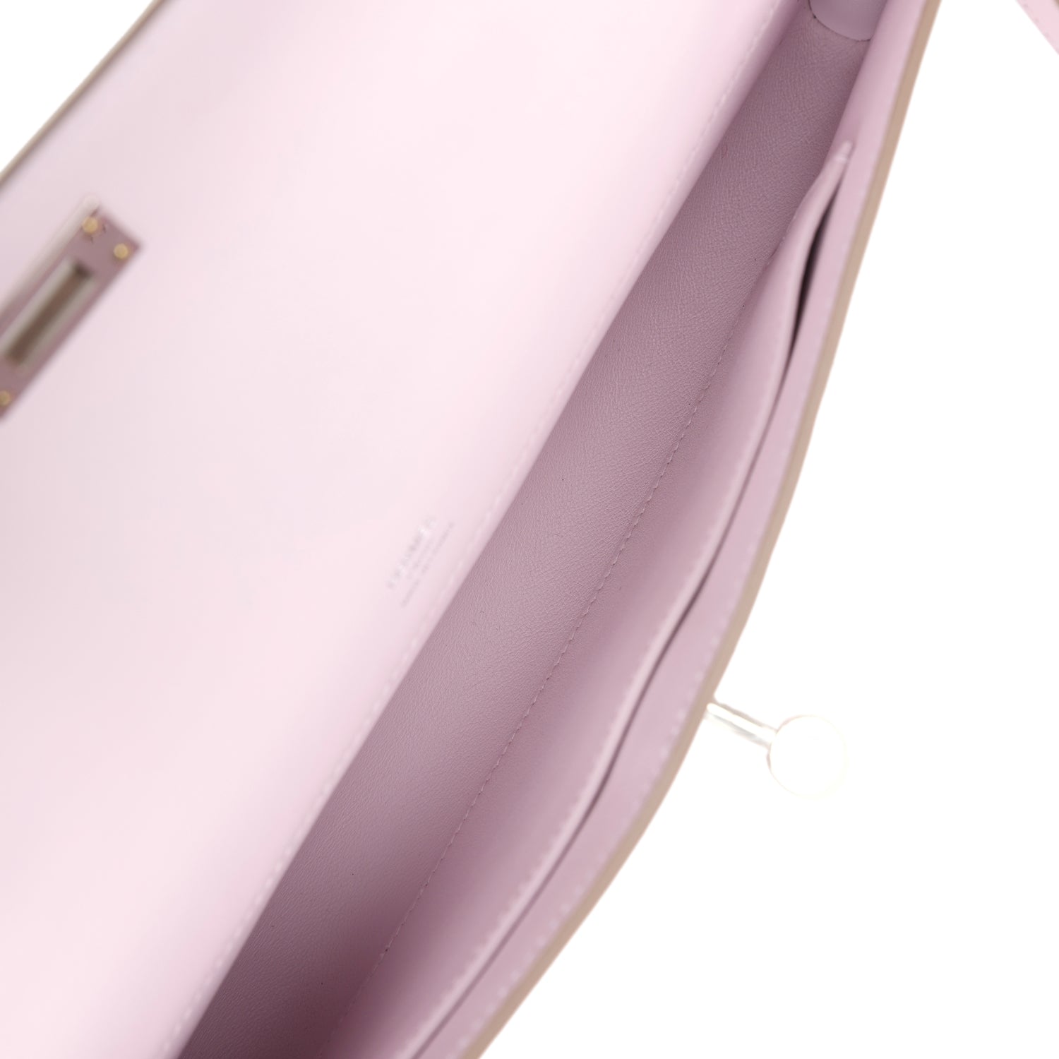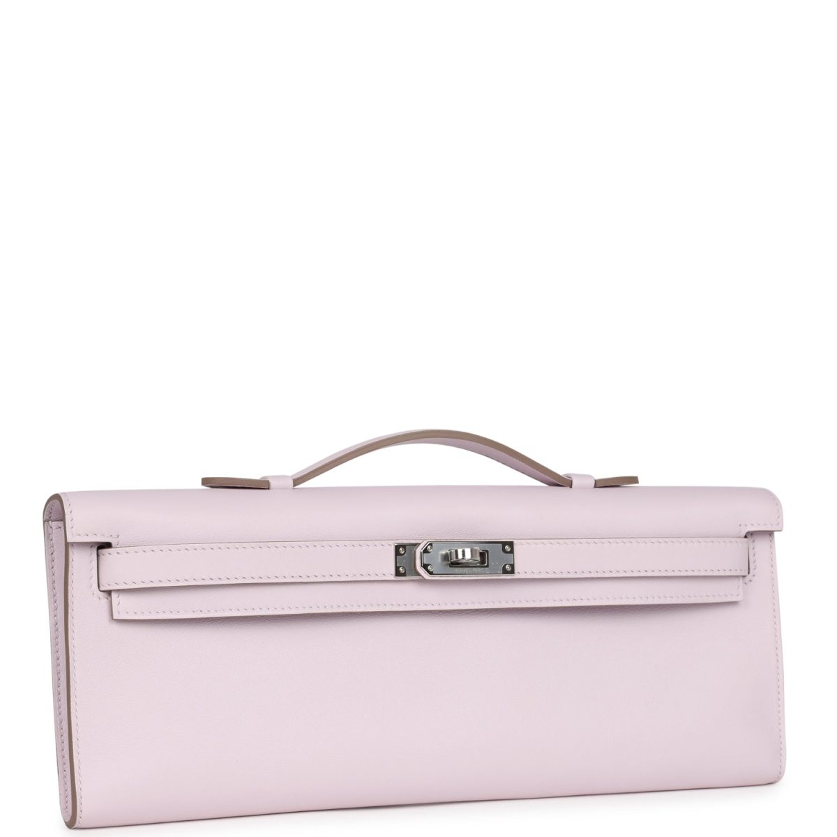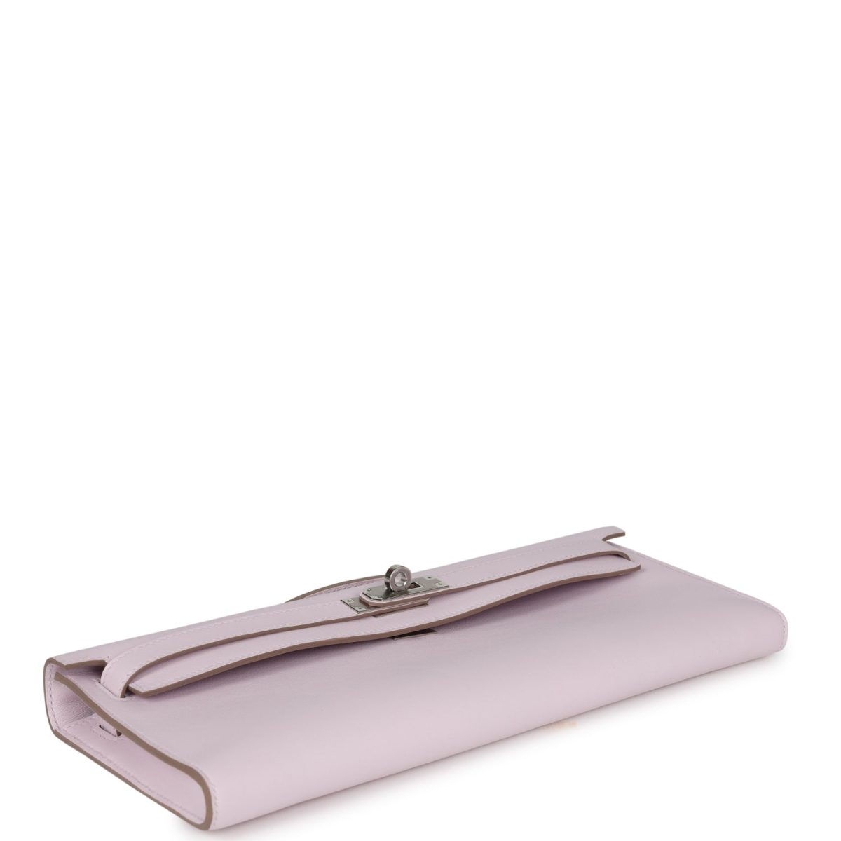This Kelly Cut wallet is in Mauve Pale swift leather with palladium hardware and has tonal stitching, two straps with front toggle closure and a top flat handle.