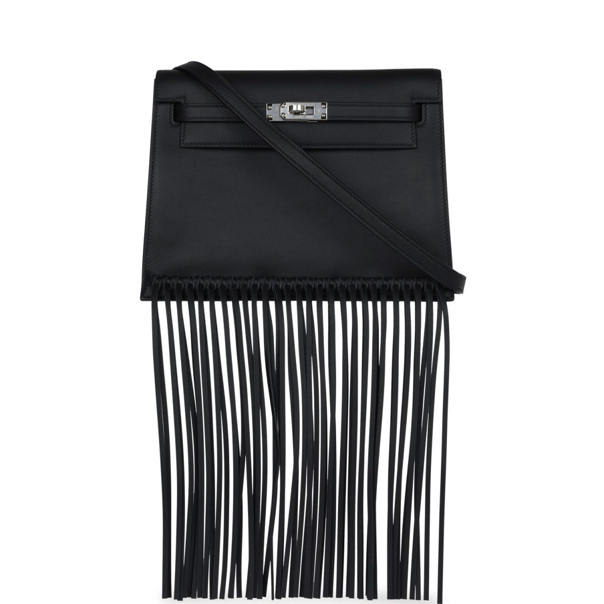 Measurements: 8.5" width x 6.5" height x 2.75" depth; 27" adjustable drop This limited edition Kelly Danse Anate is in Black swift leather with palladium hardware and has tonal stitching, long fringe detailing, two straps with front flap closure and an adjustable flat crossbody/backpack/belt strap. The interior is lined with Black lambskin and has an open wall pocket.