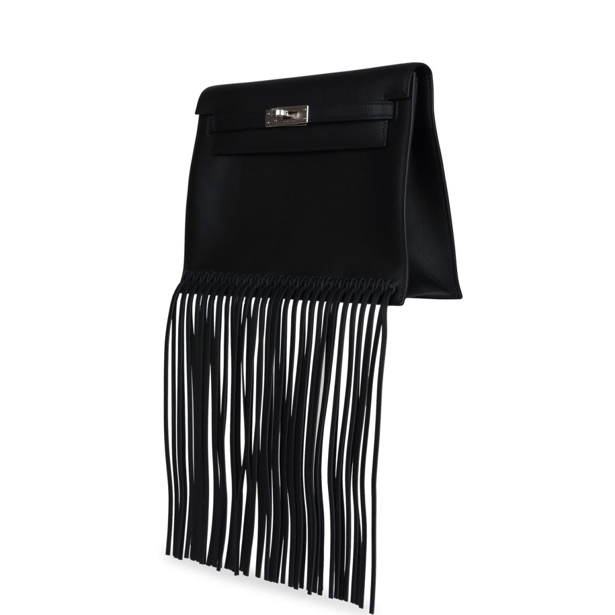 This limited edition Kelly Danse Anate is in Black swift leather with palladium hardware and has tonal stitching, long fringe detailing, two straps with front flap closure and an adjustable flat crossbody/backpack/belt strap.
