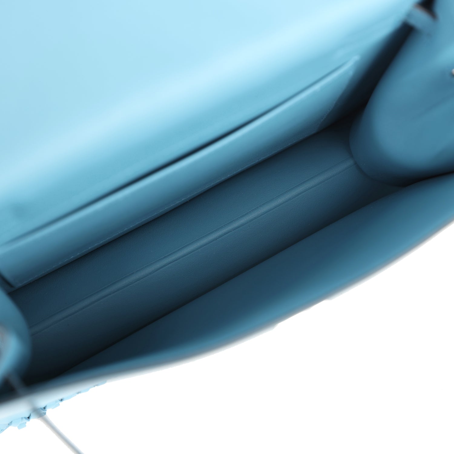 The interior is lined with Blue Jean lambskin and has an open wall pocket.