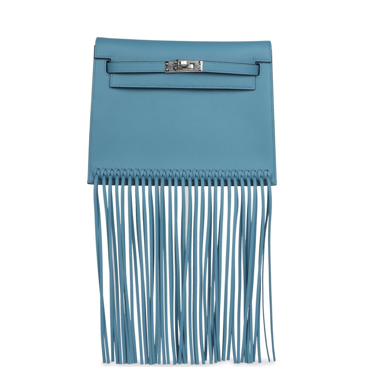 This limited edition Kelly Danse Anate is in Blue Jean swift leather with palladium hardware and has tonal stitching, long fringe detailing, two straps with front flap closure and an adjustable flat crossbody/backpack/belt strap.