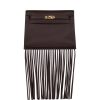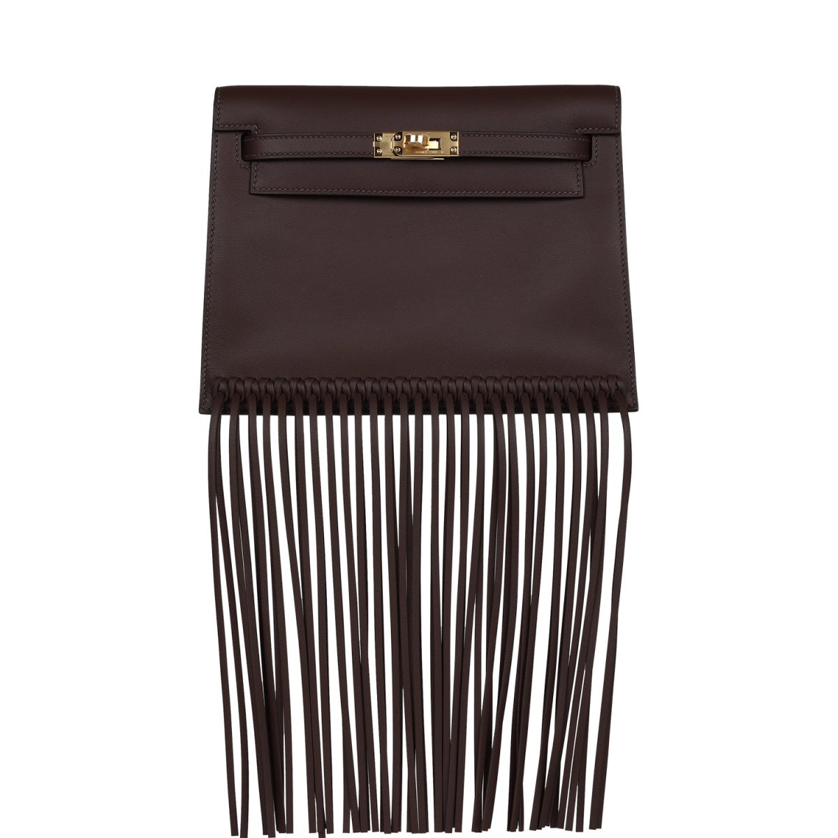 This limited edition Kelly Danse Anate is in Moka swift leather with gold hardware and has tonal stitching, long fringe detailing, two straps with front flap closure and an adjustable flat crossbody/backpack/belt strap.