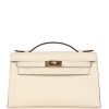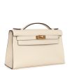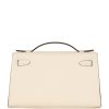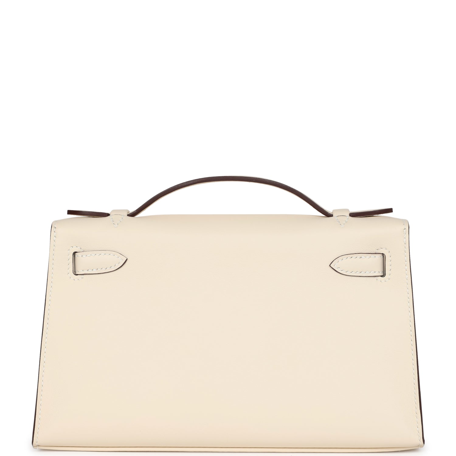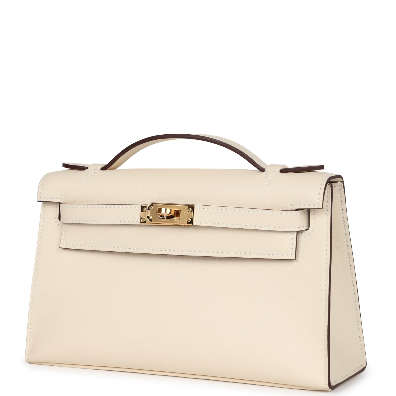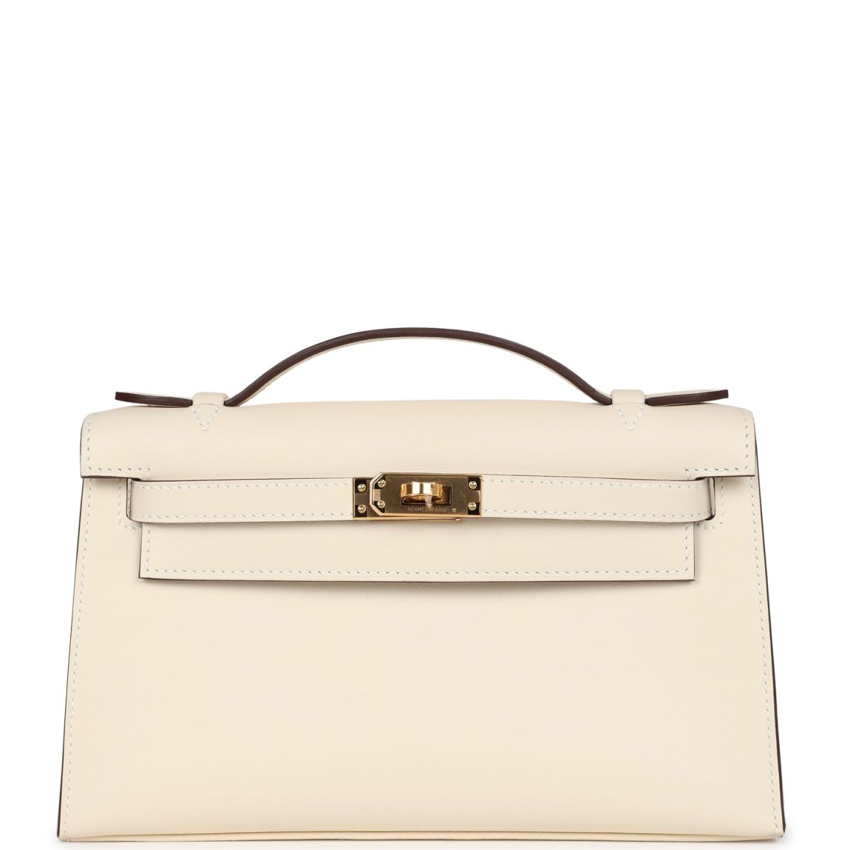This Kelly Pochette is in Natas wift leather with gold hardware and has tonal stitching, front flap, two straps with center toggle closure and a top flat handle.