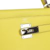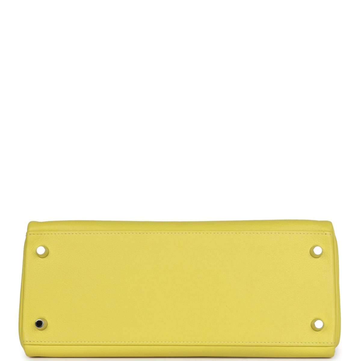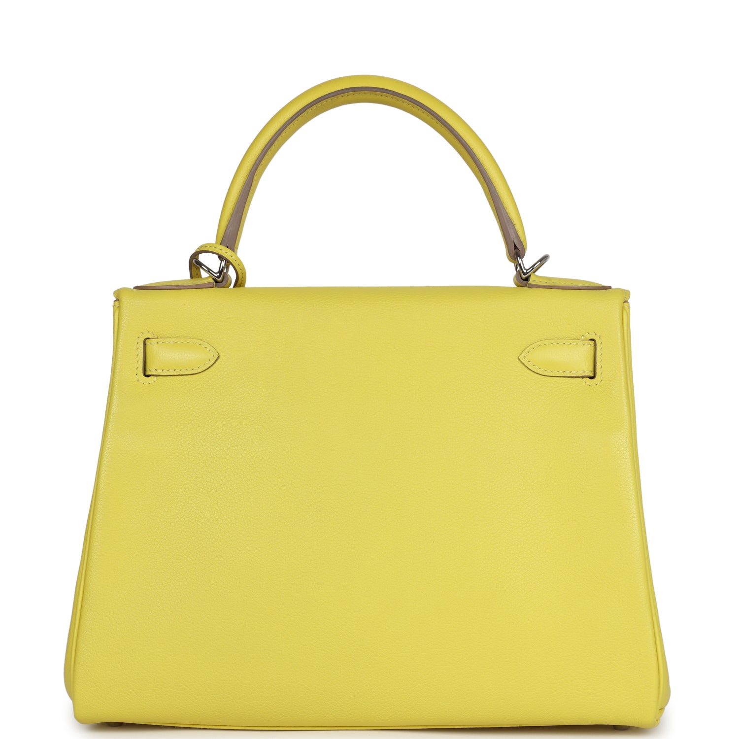 This Kelly, in the Retourne style, is in Lime evercolor leather with palladium hardware and has tonal stitching, front flap, two straps with center toggle closure, clochette with lock and two keys, single rolled handle and removable shoulder strap.