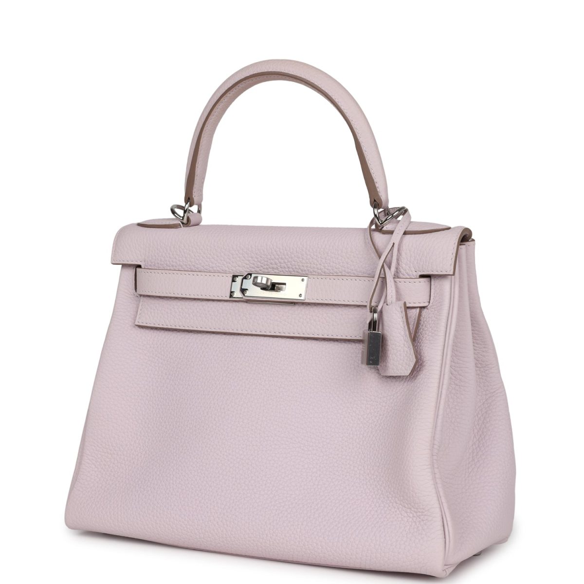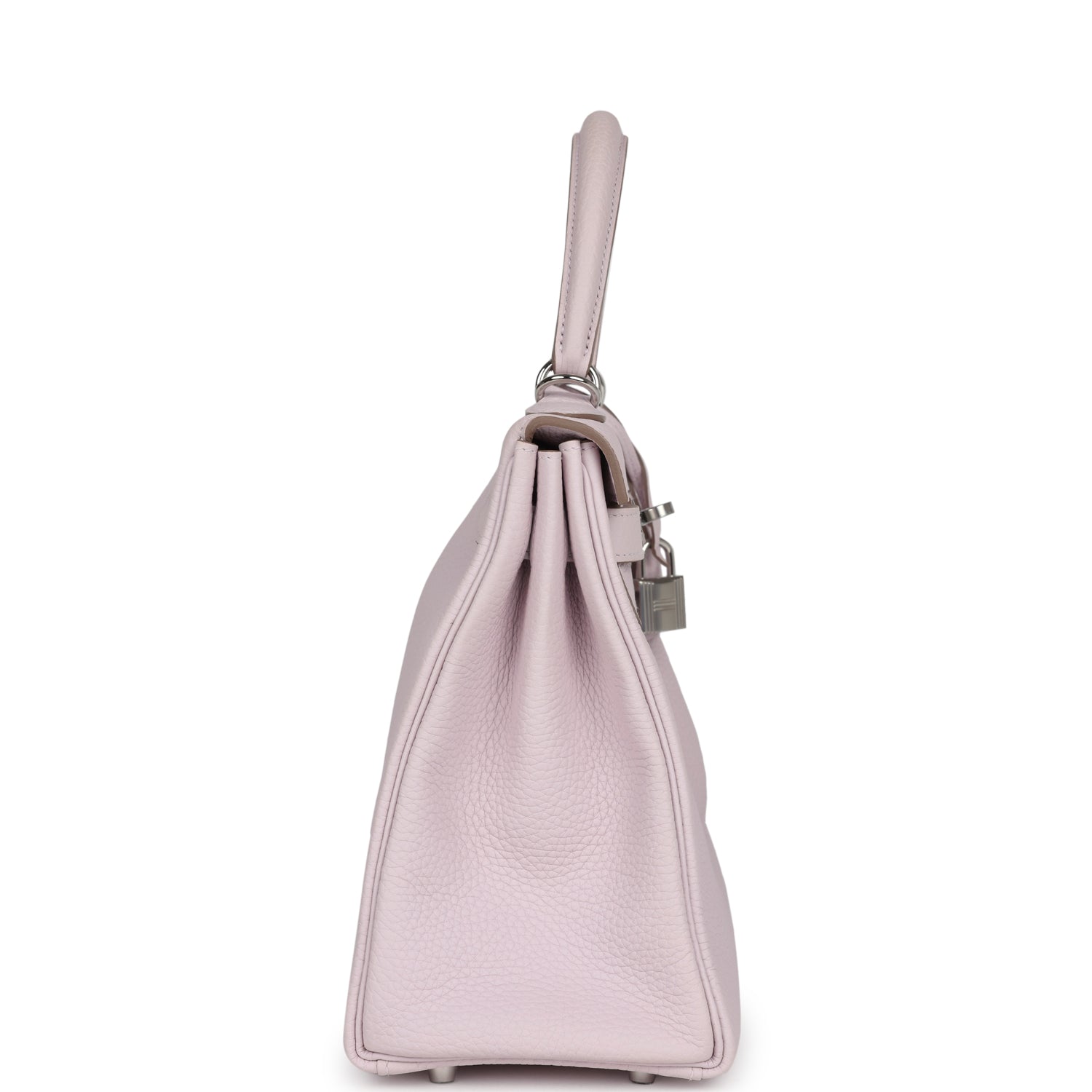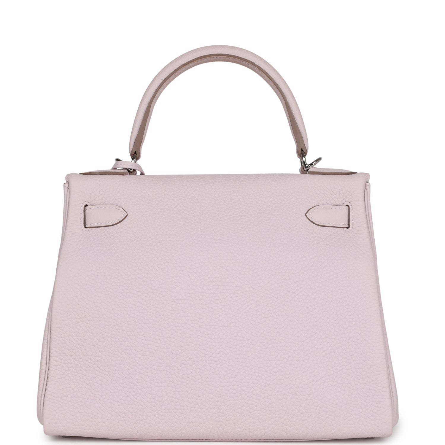 This Kelly, in the Retourne style, is in Mauve Pale clemence leather with palladium hardware and has tonal stitching, front flap, two straps with center toggle closure, clochette with lock and two keys, single rolled handle and removable shoulder strap.