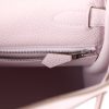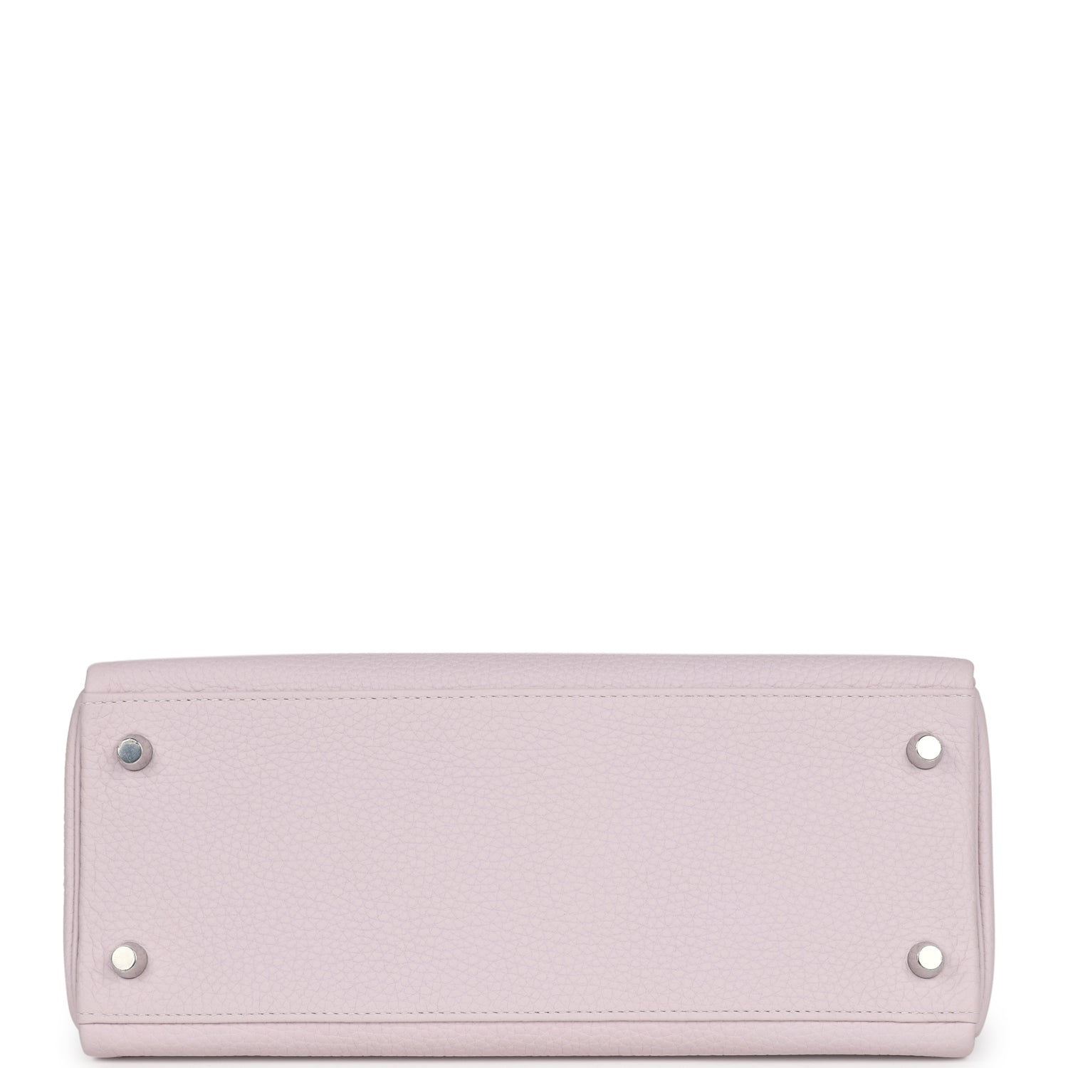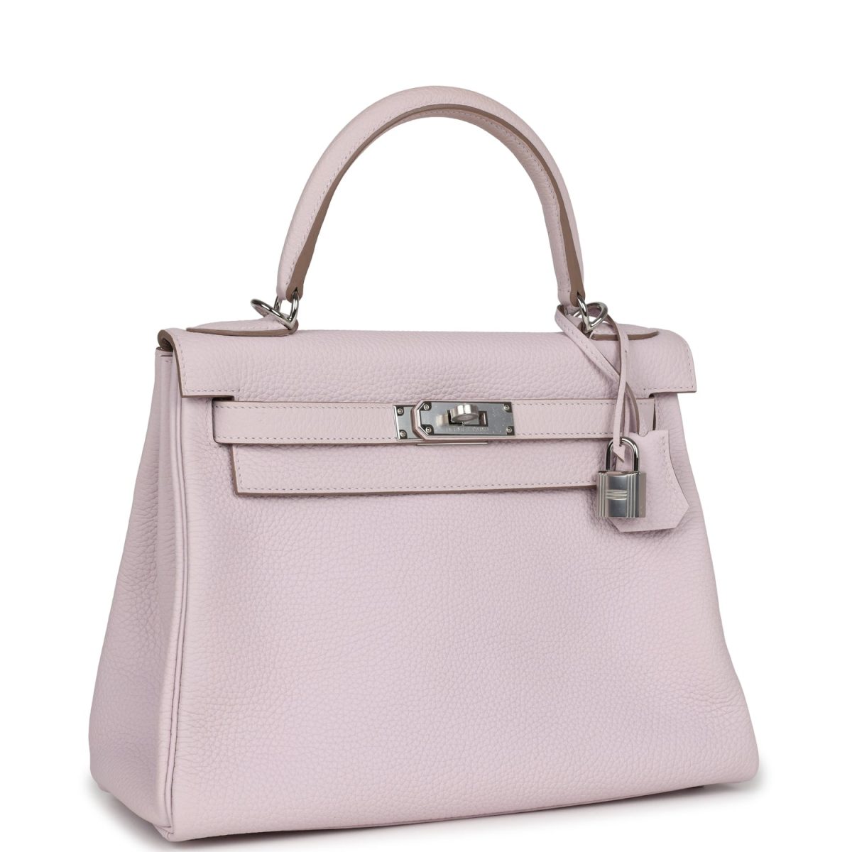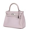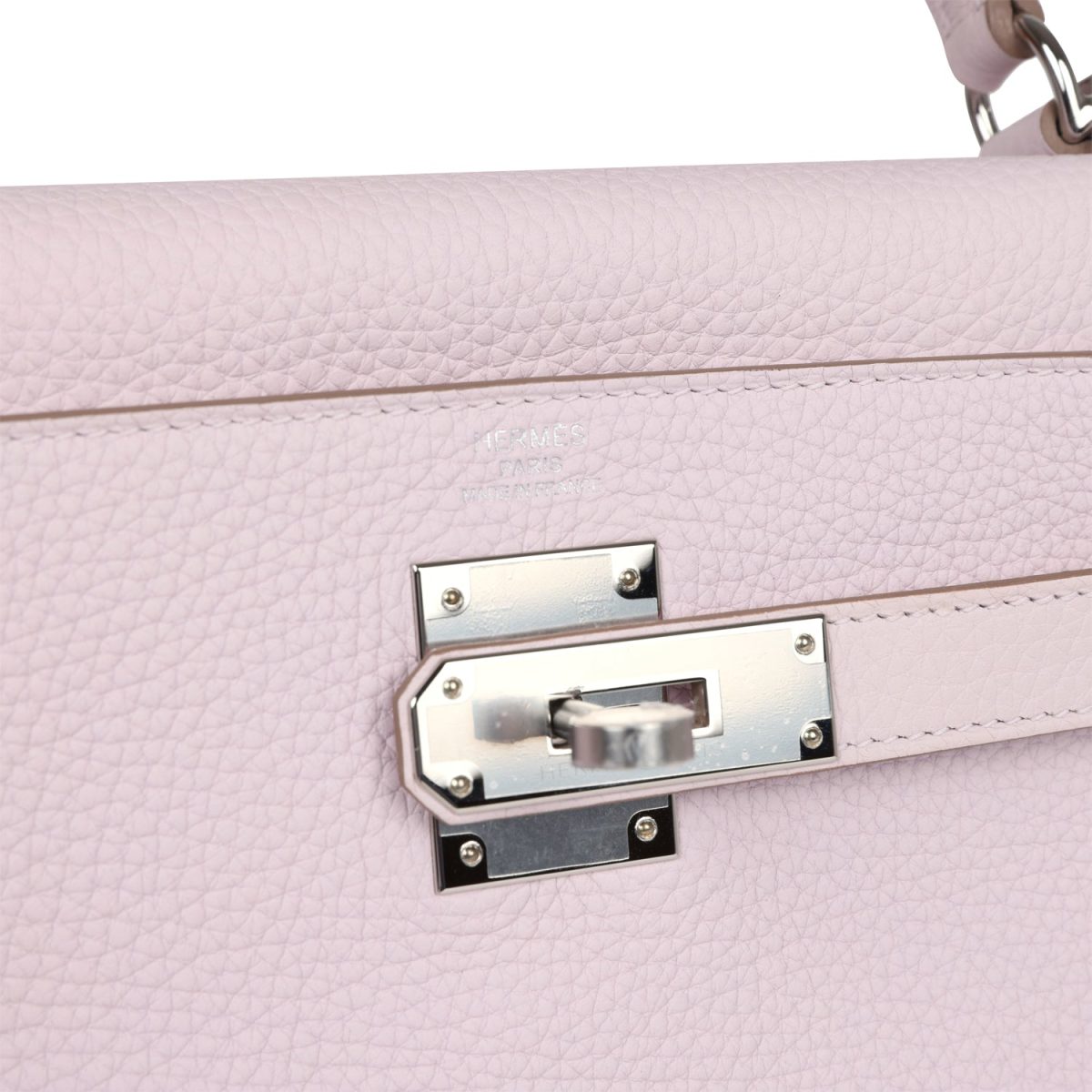 This Kelly, in the Retourne style, is in Mauve Pale clemence leather with palladium hardware and has tonal stitching, front flap, two straps with center toggle closure, clochette with lock and two keys, single rolled handle and removable shoulder strap.