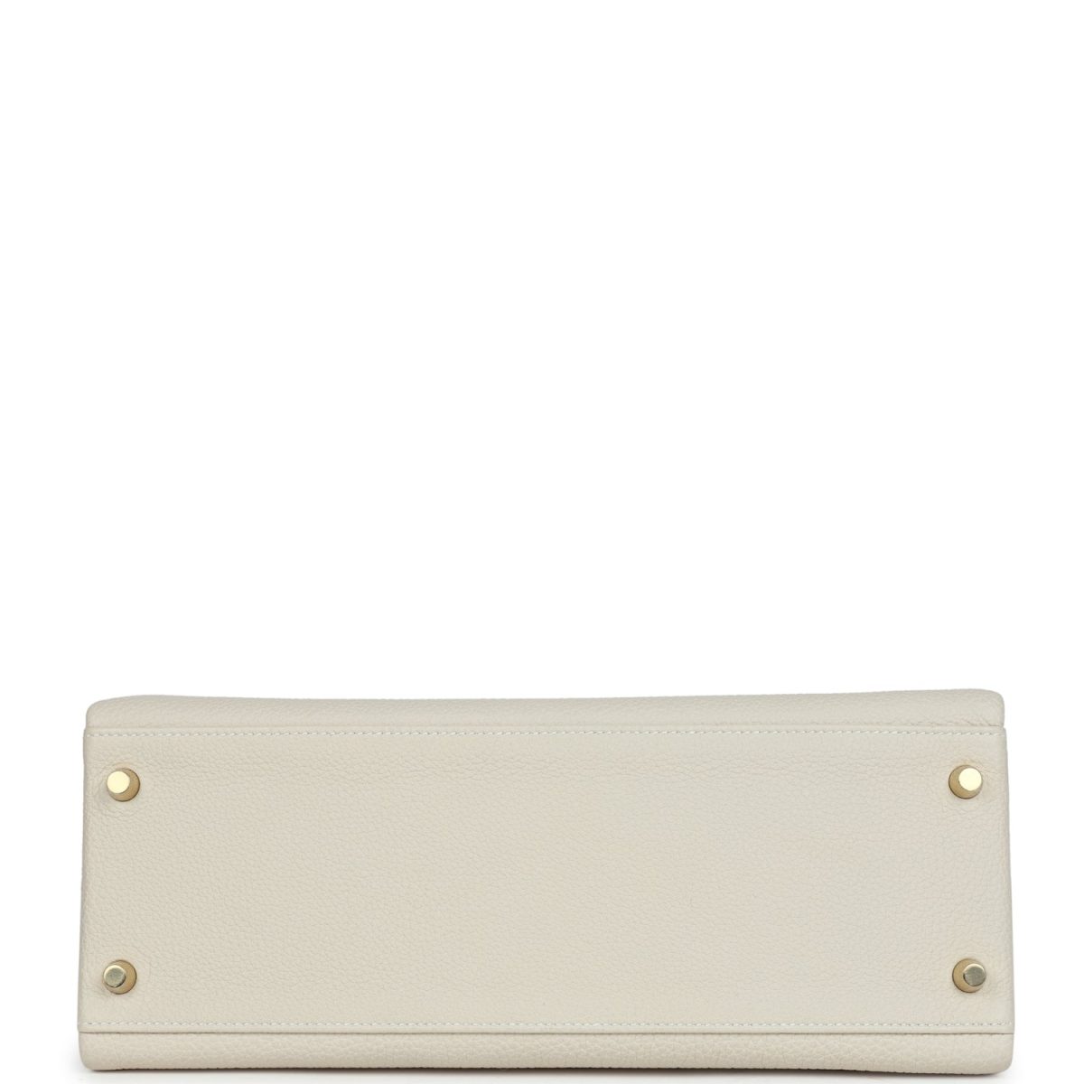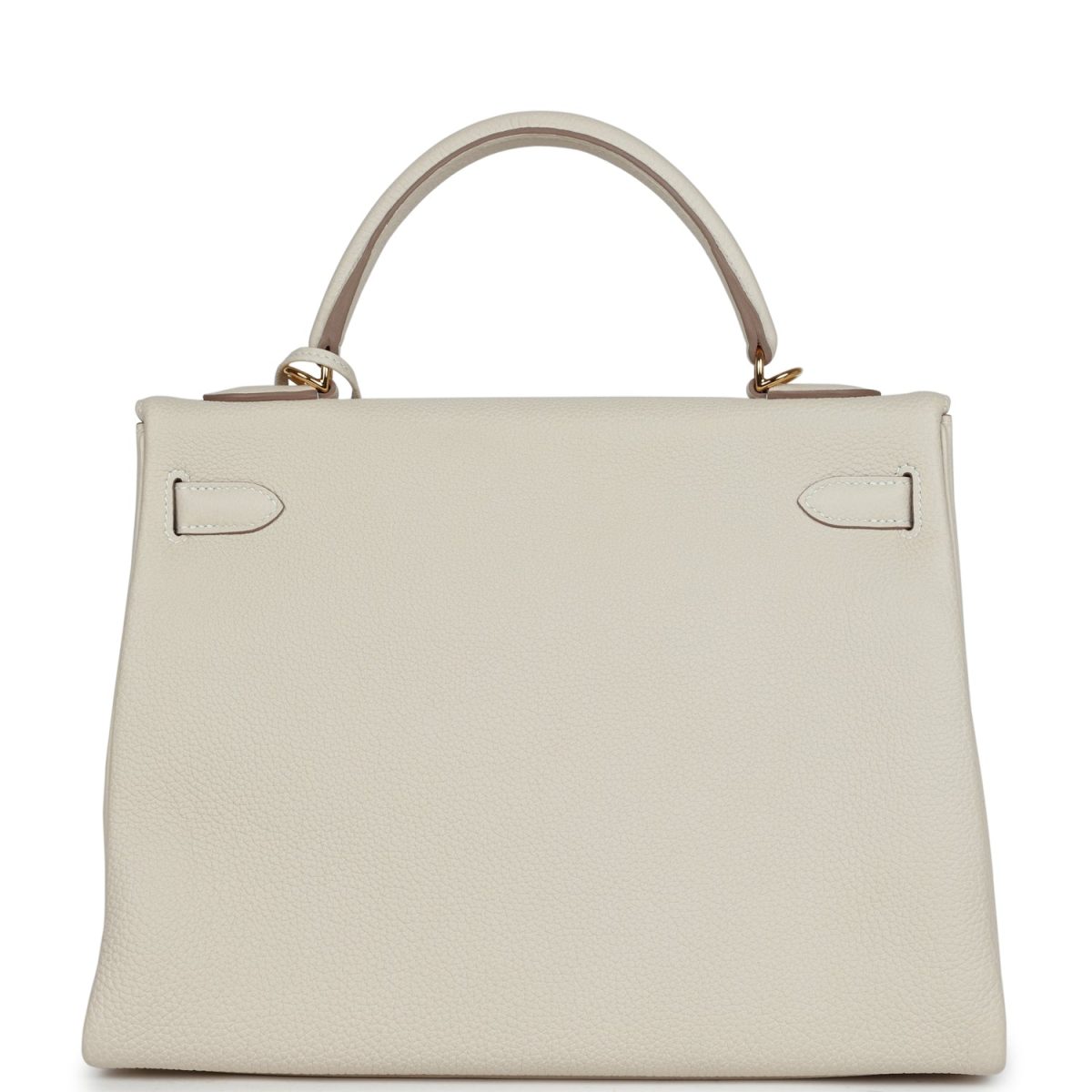 This Kelly, in the Retourne style, is in Craie togo leather with gold hardware and has tonal stitching, a front toggle closure, a clochette with lock and two keys, a single rolled handle, and a removable shoulder strap.
