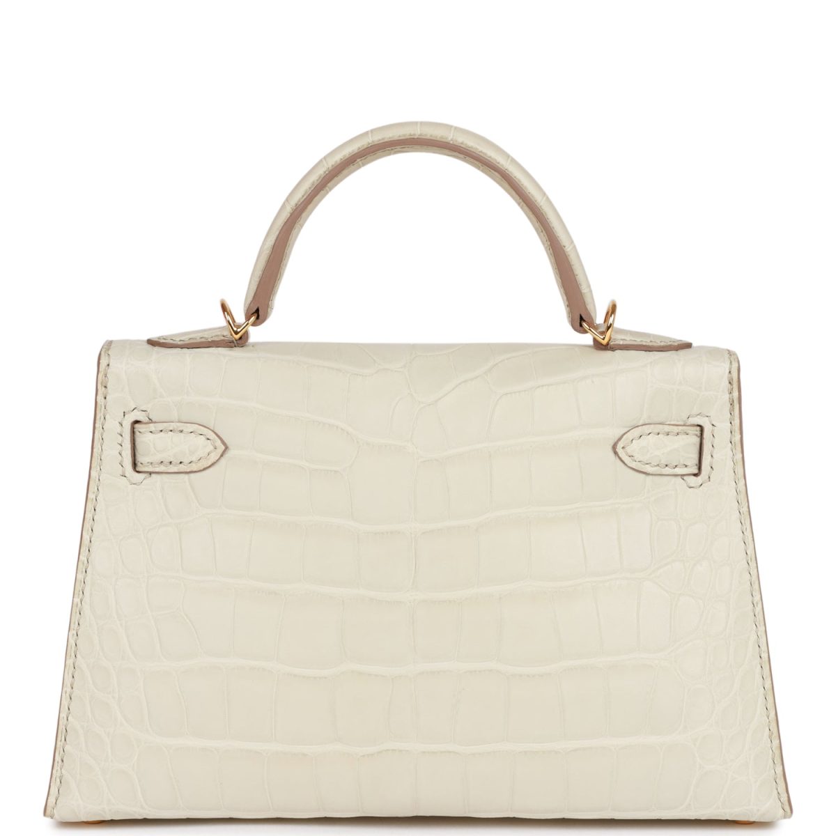 Measurements: 7.5" width x 4.5" height x 2.2" depth; 2.5" handle drop, 18.5" Shoulder Strap Drop This tiny Kelly, in the Sellier style, is in Beton matte Mississippienis alligator with gold hardware and has tonal stitching, two front straps with front toggle closure, single rolled handle and removable shoulder strap. The interior is lined with beton leather and has one open pocket on the back wall.