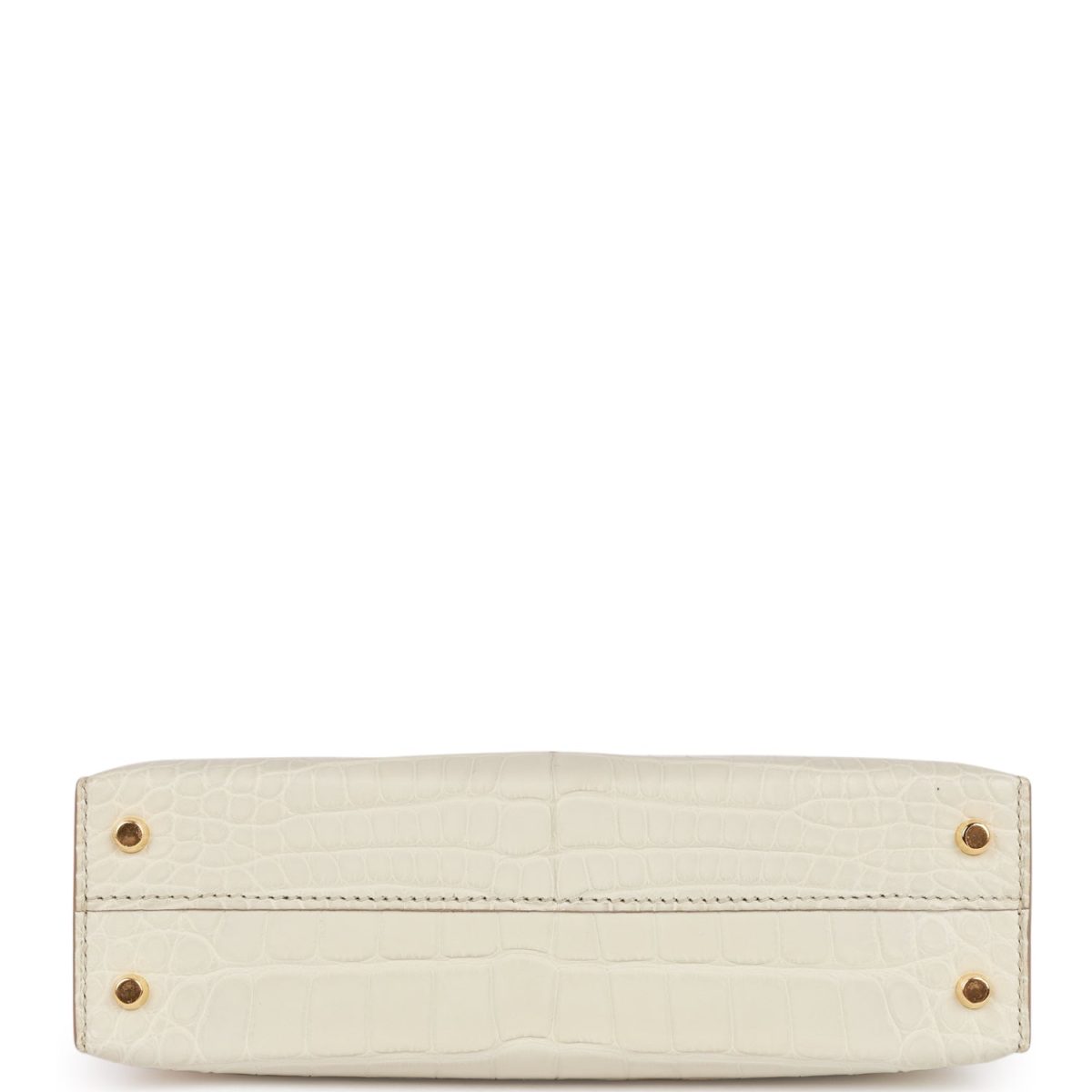 This tiny Kelly, in the Sellier style, is in Beton matte Mississippienis alligator with gold hardware and has tonal stitching, two front straps with front toggle closure, single rolled handle and removable shoulder strap.