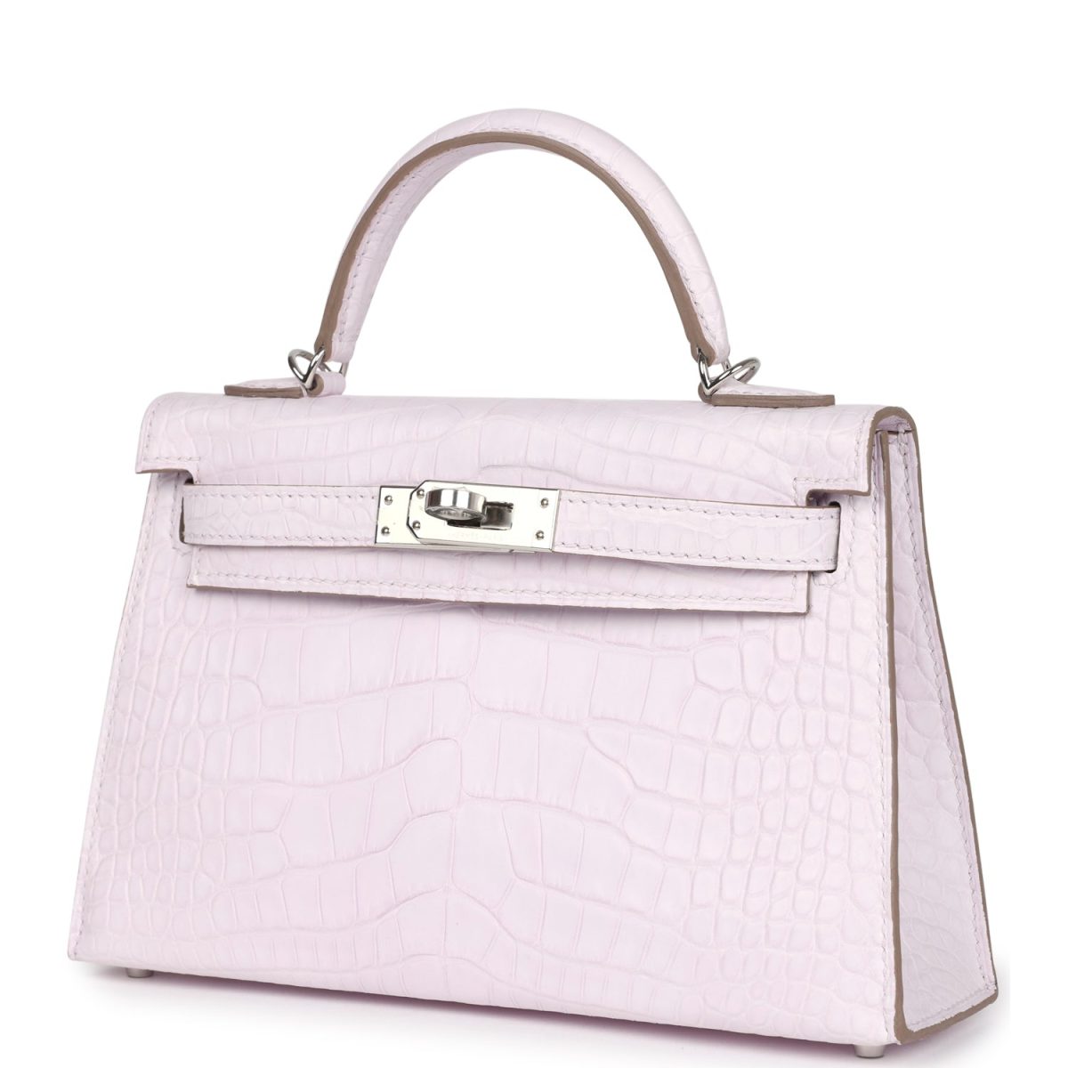 Measurements: 7.5" width x 4.5" height x 2.2" depth; 2.5" handle drop, 18.5" shoulder strap drop This Kelly, in the Sellier style, is in Mauve Pale Boreal Satin Mississippiensis Alligator leather with palladium hardware and has tonal stitching, two straps with front toggle closure, single rolled handle and removable shoulder strap. The interior is lined with Mauve Pale lambskin leather and has one open pocket on the back wall.