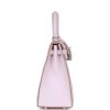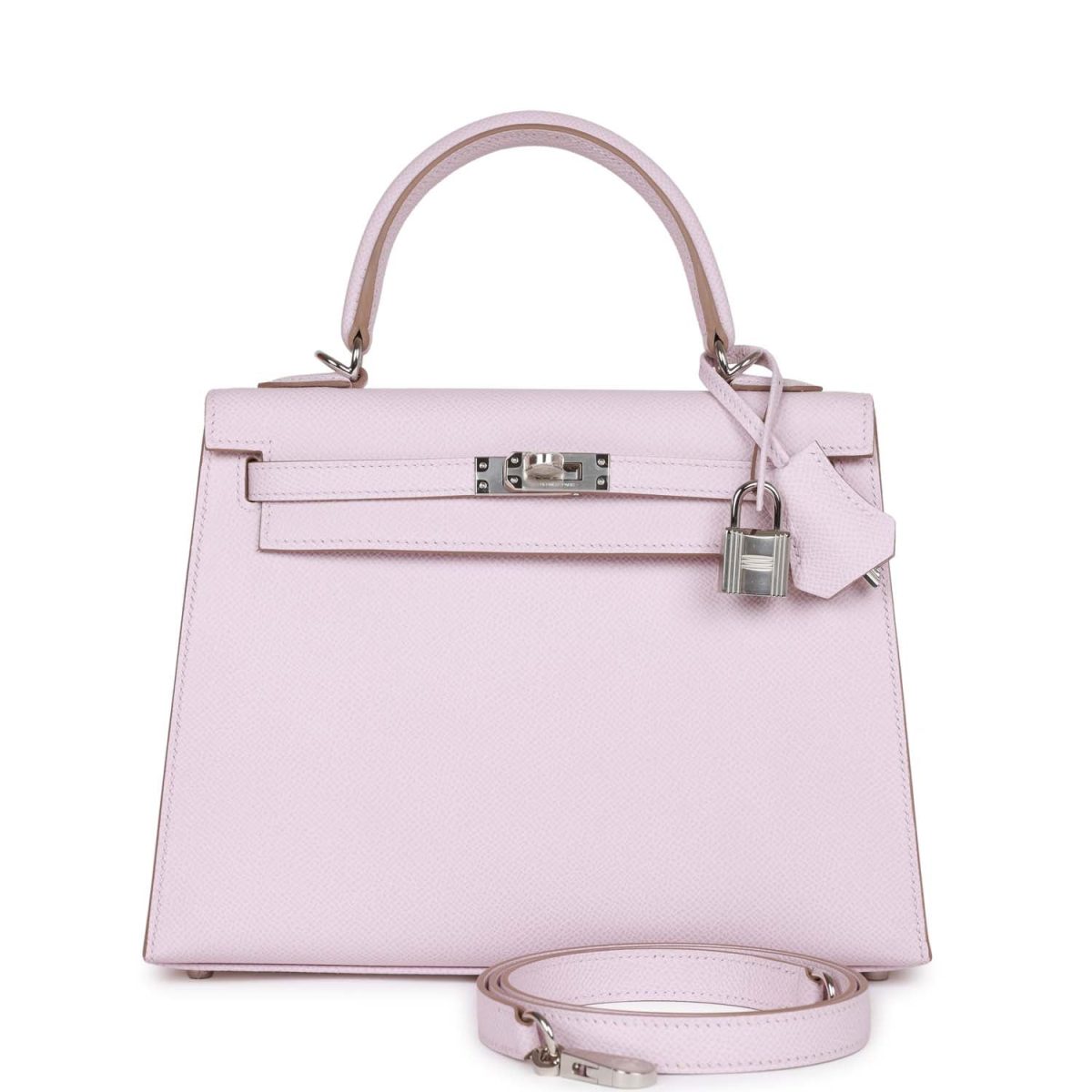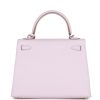 This Kelly, in the Sellier style, is in Mauve Pale epsom leather with palladium hardware and has tonal stitching, two front straps with toggle closure, clochette with lock and two keys, single rolled handle and removable shoulder strap.