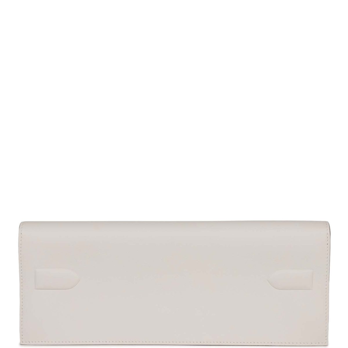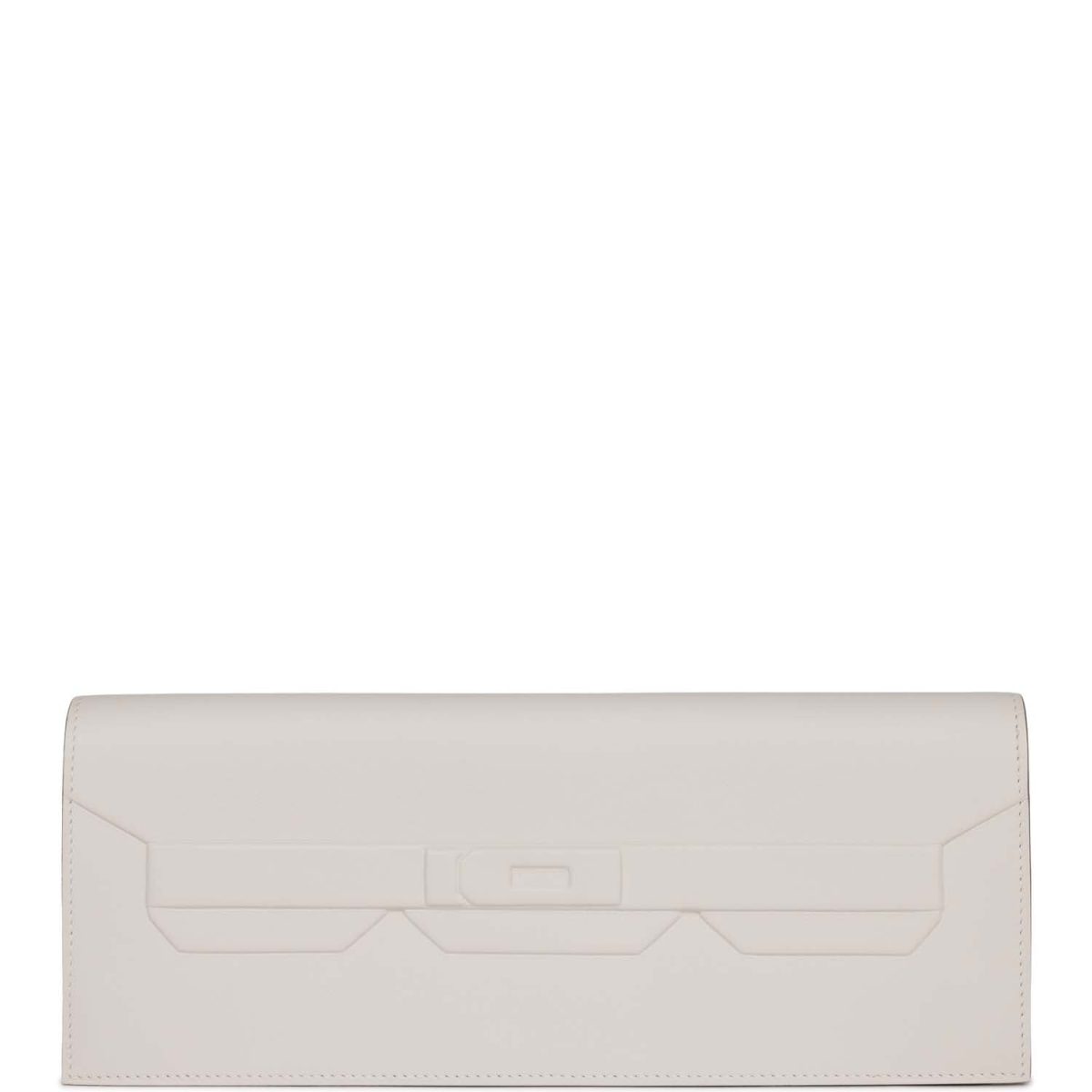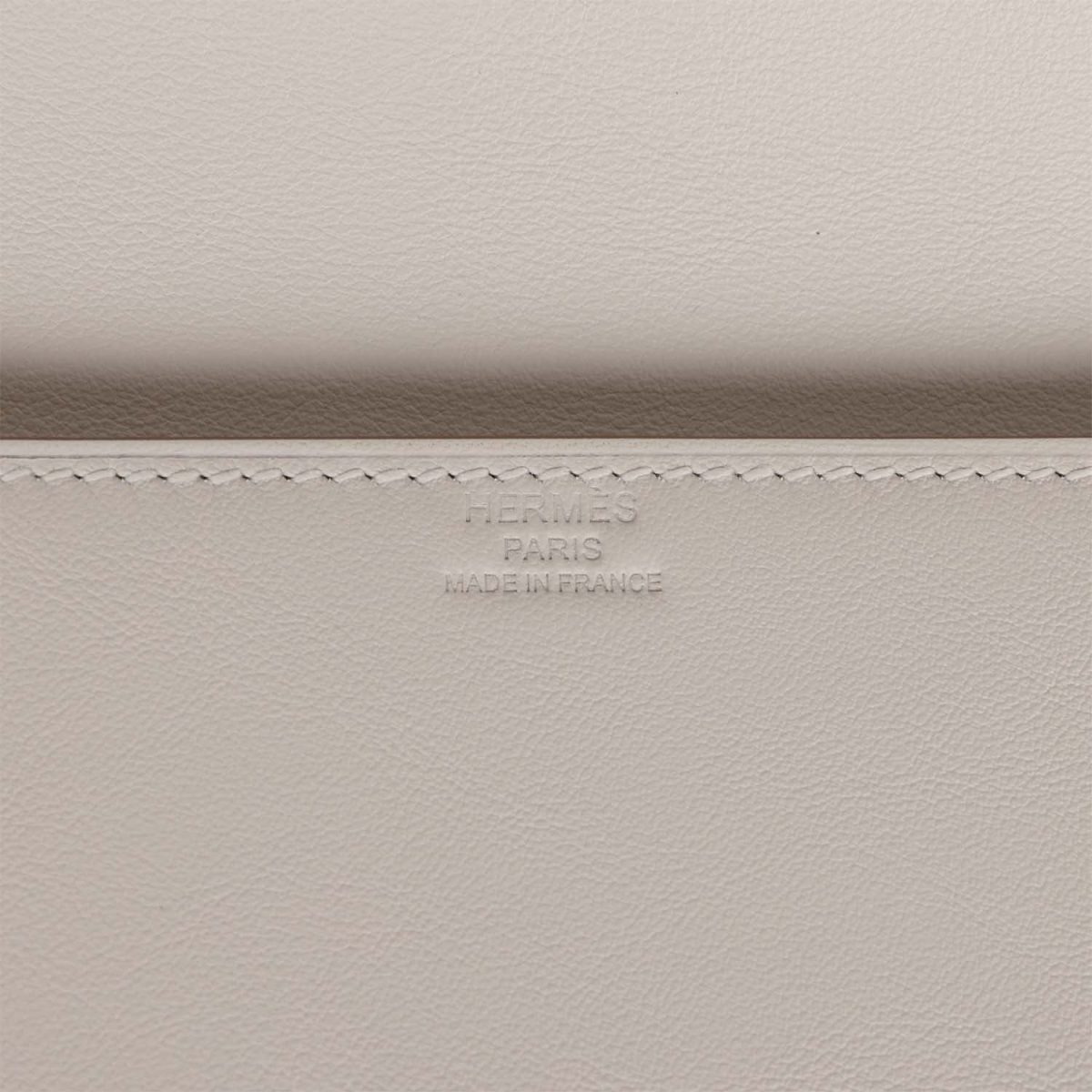Measurements: 12.25" width x 5" height x 1" depth; 1" handle drop This Kelly Cut Shadow is in Gris Pale swift leather and has tonal stitching, embossed straps with embossed front toggle closure. The interior is lined with Gris Pale chevre and has an open wall pocket.