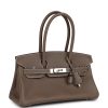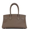 This Shoulder Birkin Light 29 is in Etoupe evercolor leather with palladium hardware and has white contrast stitching, two straps with front toggle closure, clochette with lock and two keys and double rolled handles.