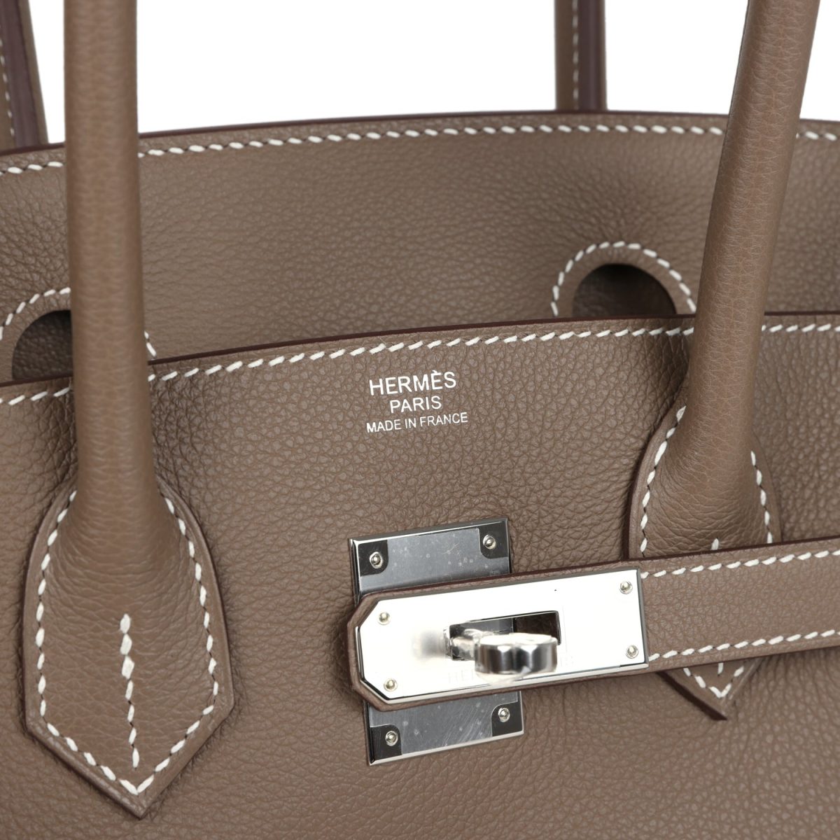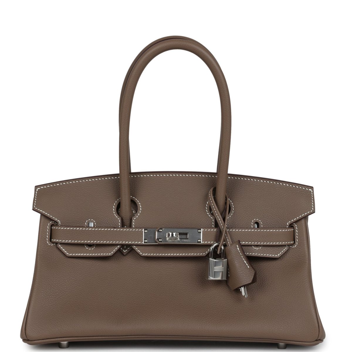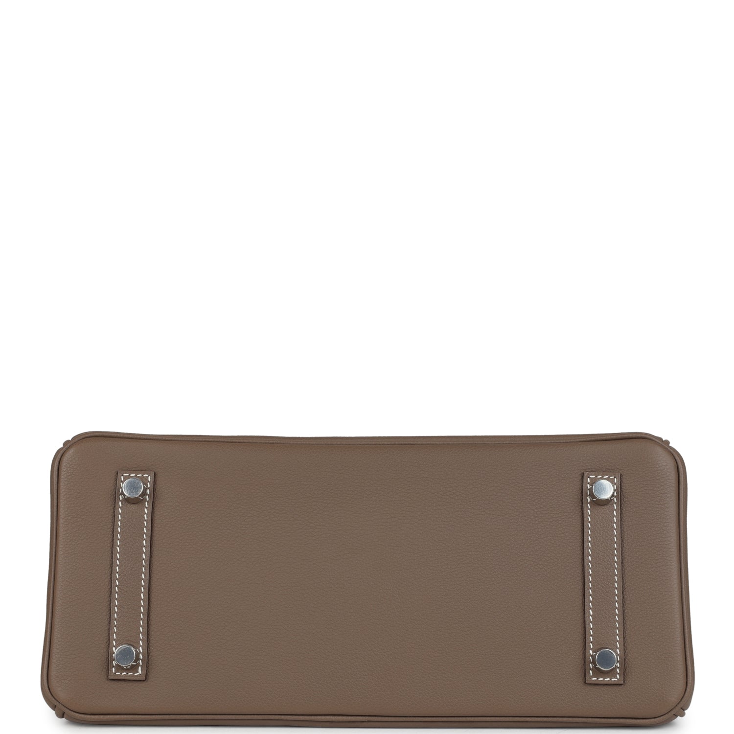 This Shoulder Birkin Light 29 is in Etoupe evercolor leather with palladium hardware and has white contrast stitching, two straps with front toggle closure, clochette with lock and two keys and double rolled handles.