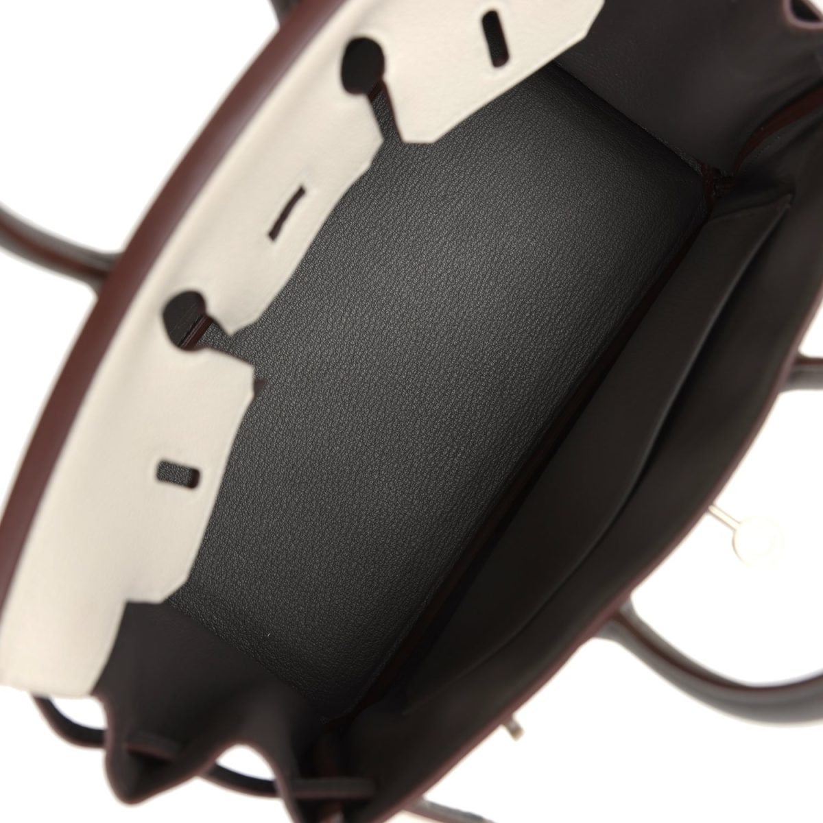 The interior is lined with Etain chevre and has one zip pocket with an Hermès engraved zipper pull and an open pocket on the opposite side.