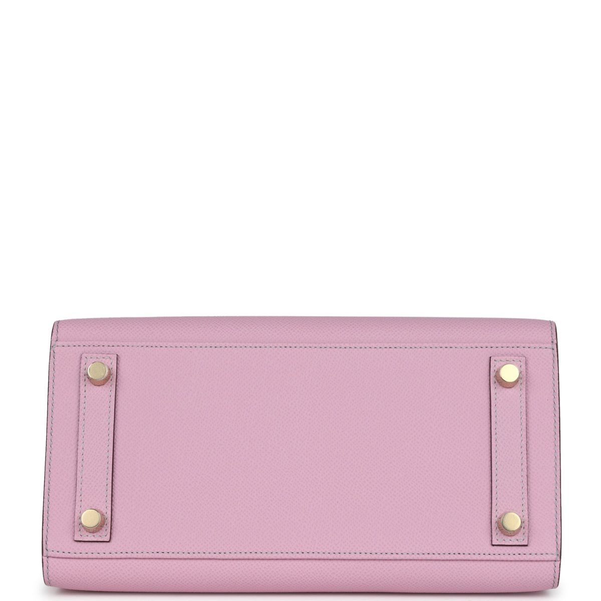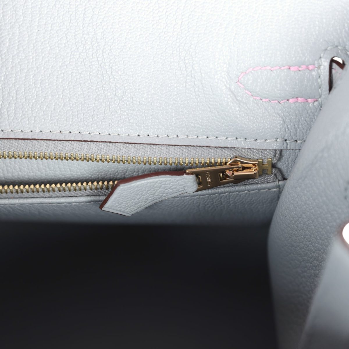 Measurements: 10" width x 7.5" height x 4.75" depth; 2.75" handle drop This Special Order Birkin is in Mauve Sylvestre and Bleu Glacier epsom leather with brushed gold hardware and has contrast stitching, front flap, two straps with center toggle closure, clochette with lock and two keys, and double rolled handles. The interior is lined with Bleu Glacier chevre and has one zip pocket with an Hermès engraved zipper pull and an open pocket on the opposite side.