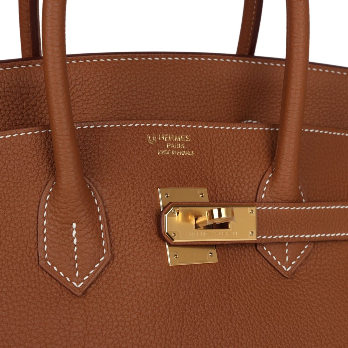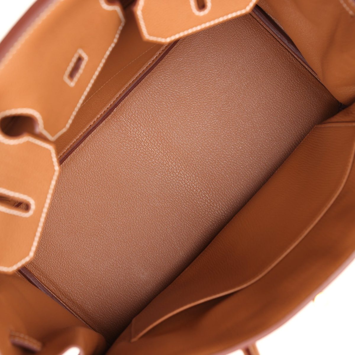 The interior is lined with Gold chevre and has one zip pocket with an Hermès engraved zipper pull and an open pocket on the opposite side.