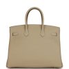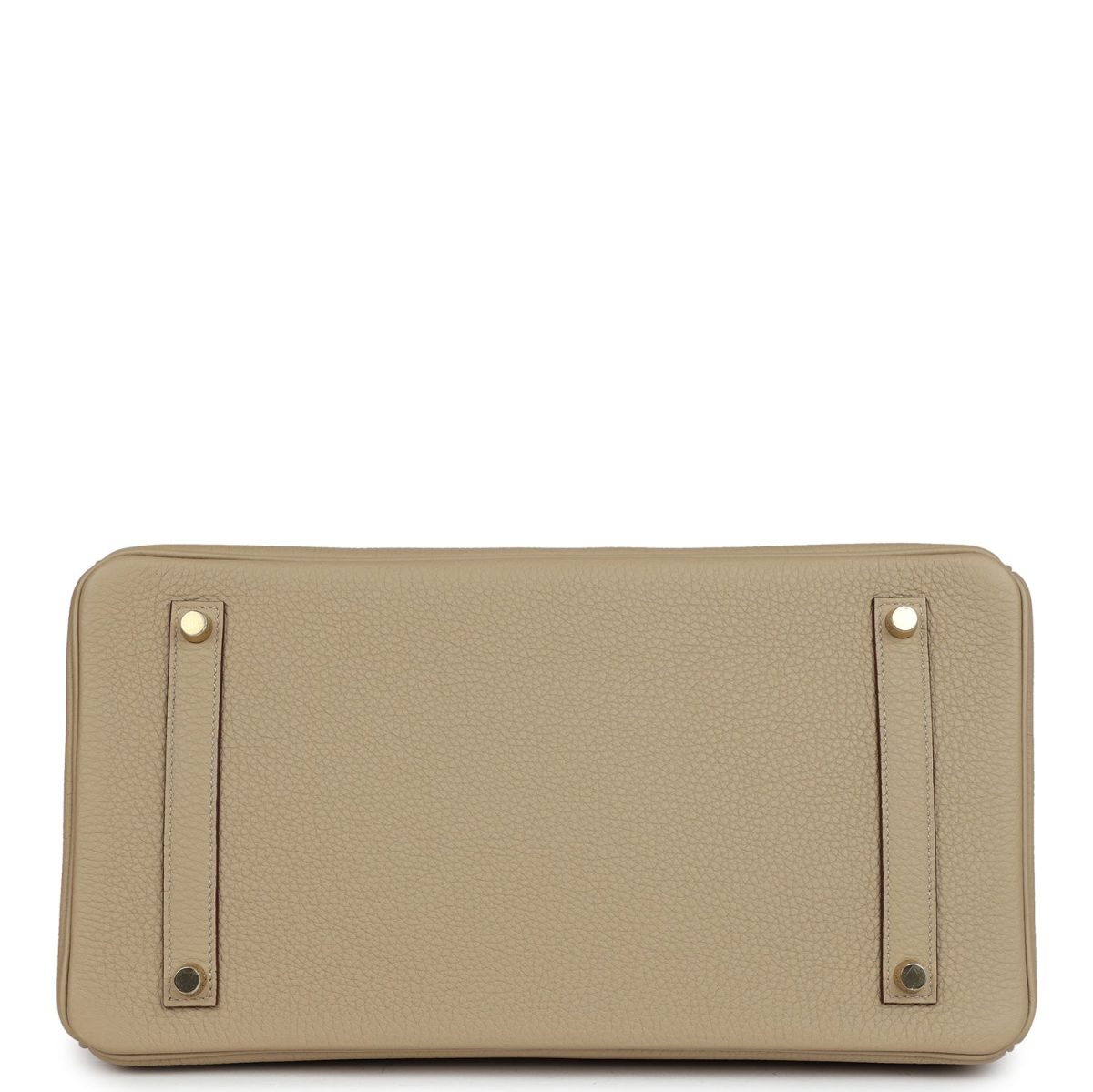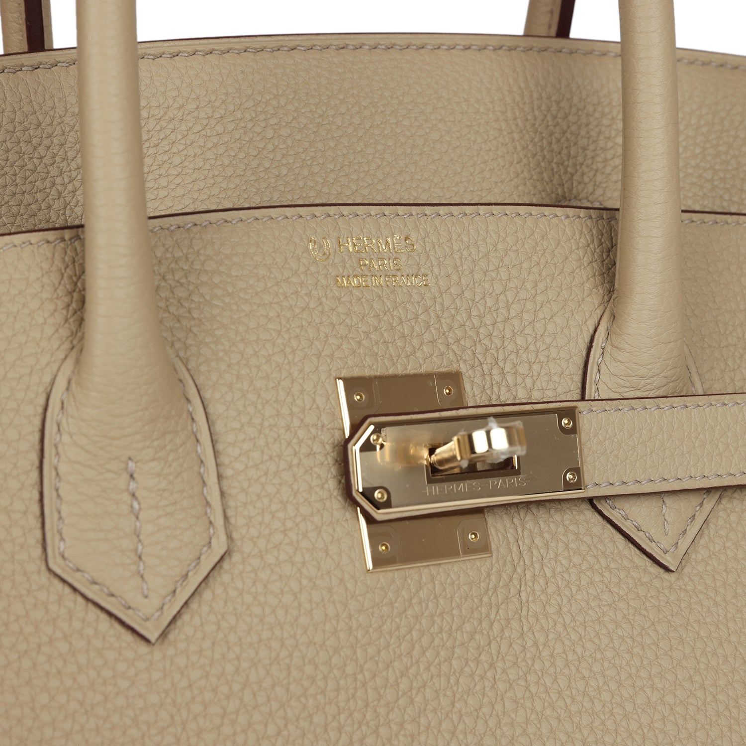 This Birkin is in Trench togo leather with permabrass hardware and has tonal stitching, a front flap, two straps with center toggle closure, clochette with lock and two keys, and double rolled handles.