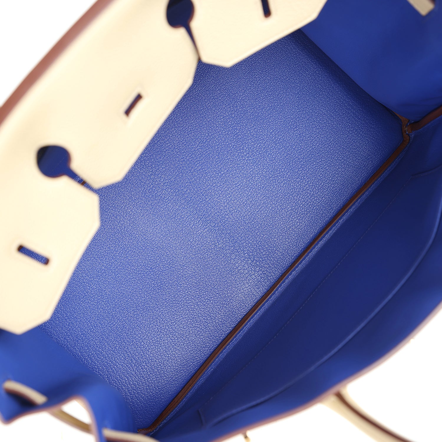 Measurements: 13.75" width x 11" height x 7" depth; 4.25" handle drop This Birkin is in Trench togo leather with permabrass hardware and has tonal stitching, a front flap, two straps with center toggle closure, clochette with lock and two keys, and double rolled handles. The interior is lined with Bleu Royal chevre and has one zip pocket with an Hermès engraved zipper pull and an open pocket on the opposite side.