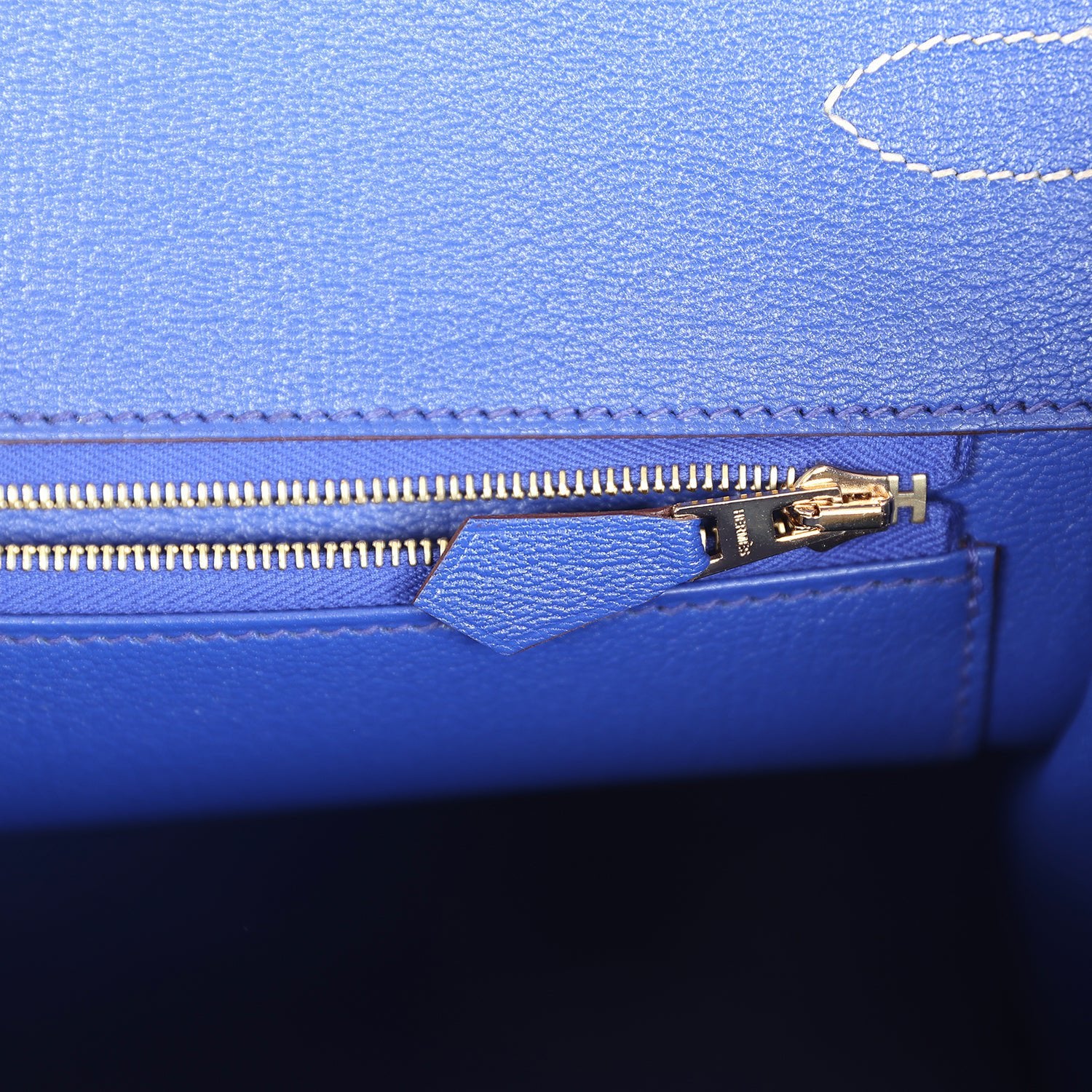 The interior is lined with Bleu Royal chevre and has one zip pocket with an Hermès engraved zipper pull and an open pocket on the opposite side.
