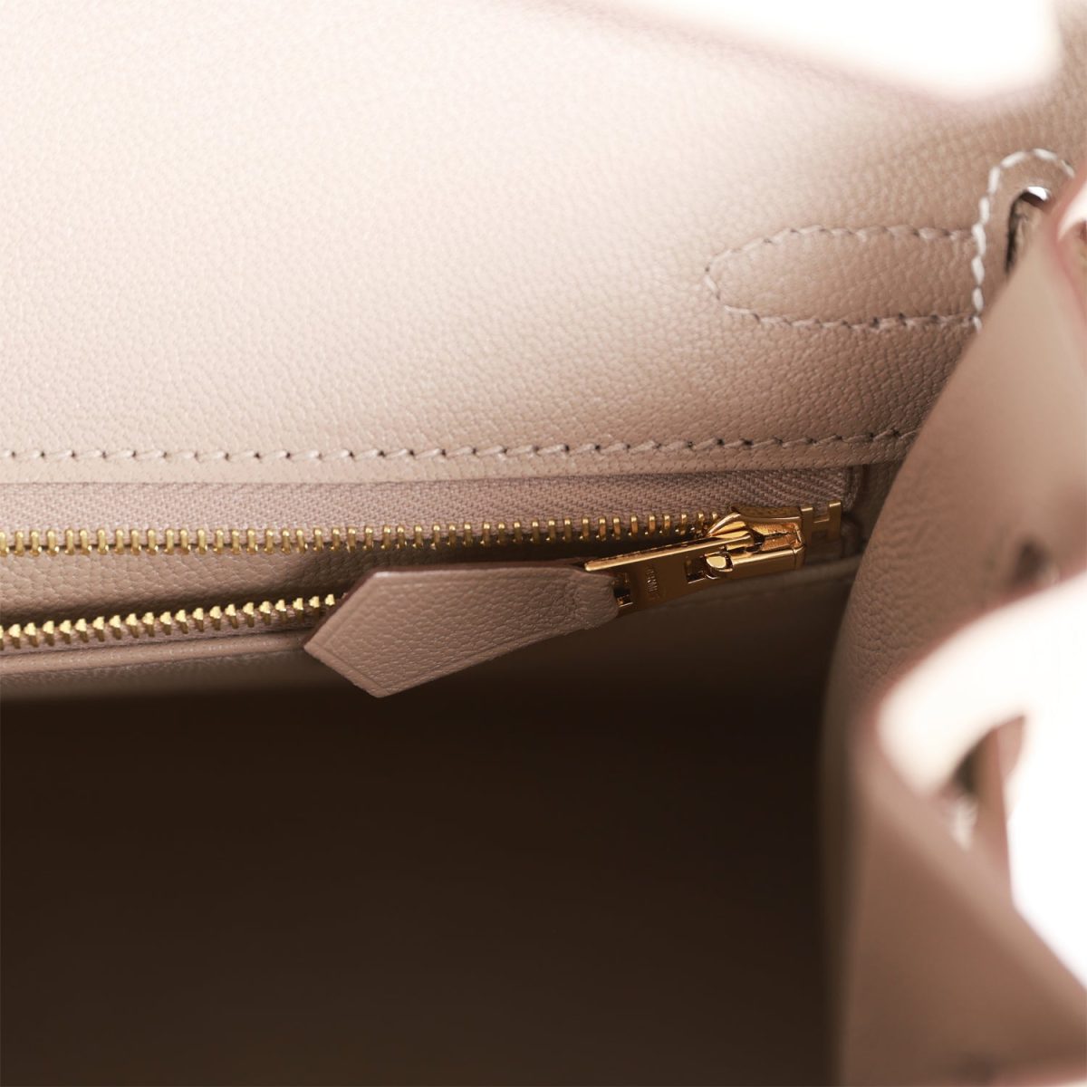 The interior is lined with Gris Asphalte chevre and has one zip pocket with an Hermès engraved zipper pull and an open pocket on the opposite side.