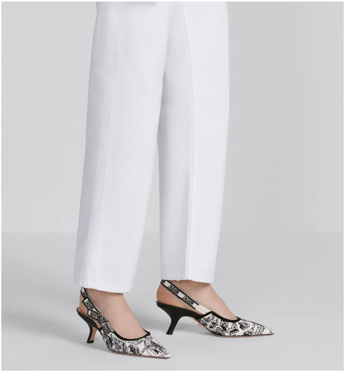 The J'Adior slingback pump is a prime example of Dior's savoir-faire. The white and black embroidered cotton style showcases the season's signature Plan de Paris motif, inspired by House archives and centered around Dior's historic address on Avenue Montaigne. The J'Adior signature embroidered ribbon, bow and 6.5 cm (2.5) comma heel complete the elegant shoe, which can be paired with other Plan de Paris creations.