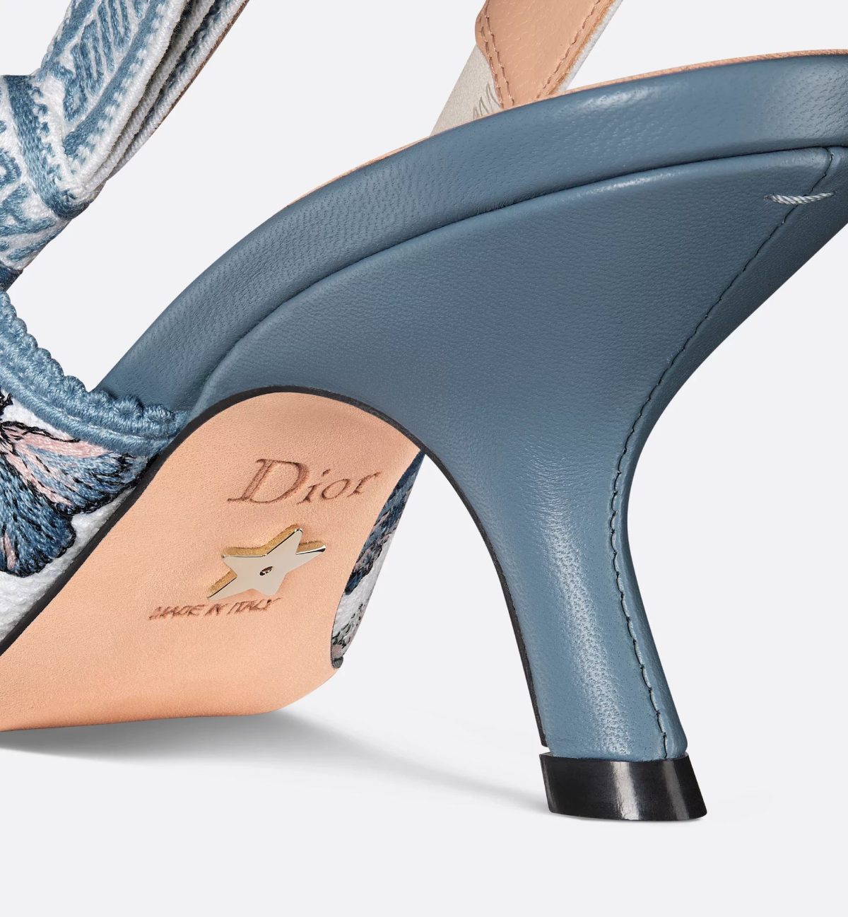 The J’Adior slingback pump is a prime example of Dior’s savoir-faire. The embroidered cotton design features Pietro Ruffo’s white multicolor Toile de Jouy Papillon motif, showcasing delicate butterflies in an elegant and dreamlike setting. Embellished with a two-tone J’Adior ribbon and flat bow, the pointed-toe shoe has a 6.5-cm (2.5-inch) comma heel and may be coordinated with other Toile de Jouy Papillon creations from the collection for a sophisticated look.