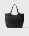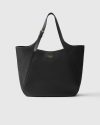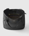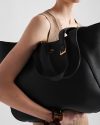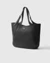 This oversized tote bag has sophisticated allure and a pragmatic character. The style, characterized by a large, convenient opening, has sleek, minimalist lines emphasized by the buttery feel of soft grain leather. The accessory is enriched with adjustable leather handles accented with the sleek, modern detail of metal buckles with an iconic design. The lettering logo embossed on the front completes the look with an elegant, refined note.