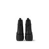 This reinterpretation of the Laureate platform desert boot contrasts a masculine aesthetic with feminine lace, incorporating a pattern of Monogram Flowers. This model is notable for its chunky rubber outsole, which is decorated with LV Initials inspired by the lozine edging of Louis Vuitton trunks. It comes with long leather laces, which wrap around the ankle.