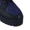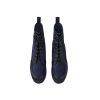 The Laureate platform desert boot is reworked in raw indigo denim with coordinating leather trim. This model is distinguished by its long leather laces and chunky platform outsole, which is embellished with LV Initials referencing the lozine edging of Louis Vuitton trunks. The side of the boot is signed with an oversized LV Initials logo.