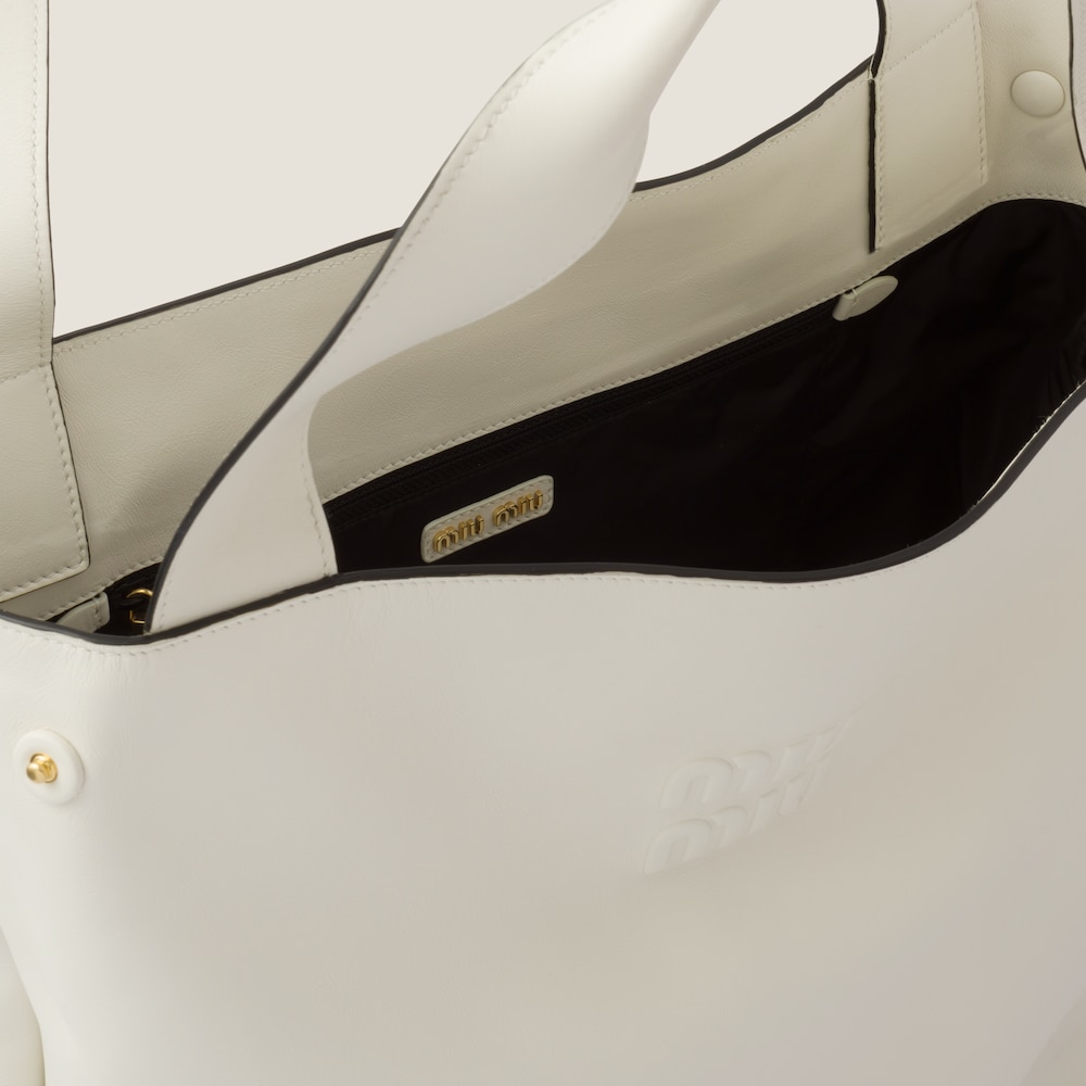 Cosmopolitan, versatile, and essential: the new leather hobo bag simultaneously displays classic allure and an expression of dynamic, ever-changing modernity. The embossed lettering logo decorates the design with iconic Miu Miu style while the Re-Nylon lining completes the aesthetic with a refined detail.