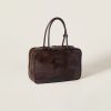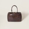 The Beau bag is part of the Miu Miu Upcycled limited edition selection, born as a result of Miu Miu’s interest in conscious fashion and circular design practise with the aim of giving new life to vintage garments, bags, and accessories that have been redesigned and reworked. The bag repurposes materials from past styles that are carefully stitched together with great care and attention to the structure, texture, and color to create something completely new. Distinctive elements are the refined patches, hand-stitched logo, and a deliberate vintage look.