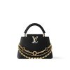 Part of the Trilogy line, this Capucines BB is the epitome of sophistication with its triple chain adornment. Look closely to notice the jewel-like chain details, including signature mini padlocks and enameled Monogram flowers. This double-carry style is crafted from iconic Taurillon leather and is accented with gold-toned hardware. It is fitted with multiple interior pockets and can be worn several ways.