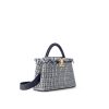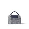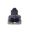 Dressed in a warm, luminous tweed, this season’s Capucines MM handbag is a summery interpretation of the iconic design. The fabric is woven from a mix of navy and white raffia, cotton ribbons and silvery threads, with a fringed finish that gives the bag a crafted look. The flap, handle and strap are made from navy-blue grained Taurillon.