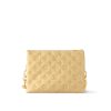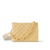 The Coussin PM is made from puffy lambskin, embossed with the Monogram, and features a chunky chain on which golden metallic links alternate with plexiglass links for a luminous touch of color. The Coussin has two inside compartments separated by an inside zipped pocket. In addition to the detachable chain, there is a wide removable strap.