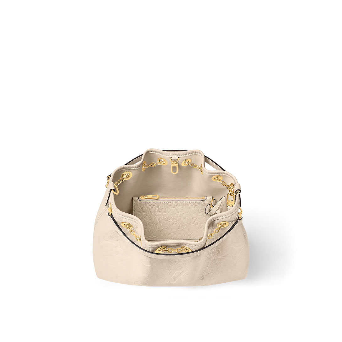 The LV Bundle bag is made from Monogram Empreinte leather with gold-color hardware, including on the chain drawstring. This “day to evening” bag’s sleek lines will match almost any summer outfit. It has two handles for fashionable hand carry as well as an adjustable and removable strap for comfortable cross-body and shoulder wear.