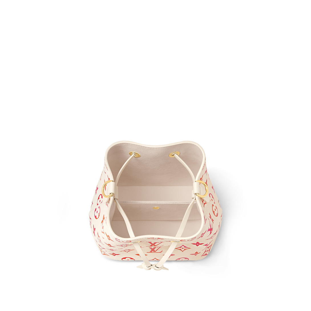 The Aquarelle collection brings a colorful element to the Monogram Empreinte leather of this compact NéoNoé BB bucket bag. Inspired by the soft hues of sunset, a digital printing technique creates orange, pink and fuchsia shades within the Monogram embossing of the leather. A removable handle and a removable and adjustable strap offer multiple carry options.