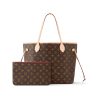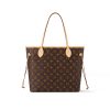 The Neverfull MM tote unites timeless design with heritage details. Made from supple Monogram canvas with natural cowhide trim, it is roomy yet not bulky, with side laces that cinch for a sleek allure or loosen for a casual look. Slim, comfortable handles slip easily over the shoulder or arm. Lined in colorful textile, it features a removable pouch which can be used as a clutch or an extra pocket.
