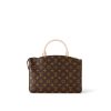 The timelessly feminine Petit Palais tote bag is made from Monogram canvas, trimmed with natural leather, and lined in a lush red textile. A removable and adjustable strap, in addition to Toron top handles, enables multiple carrying options. The gold-color padlock on the luggage tag evokes the House’s travel heritage.
